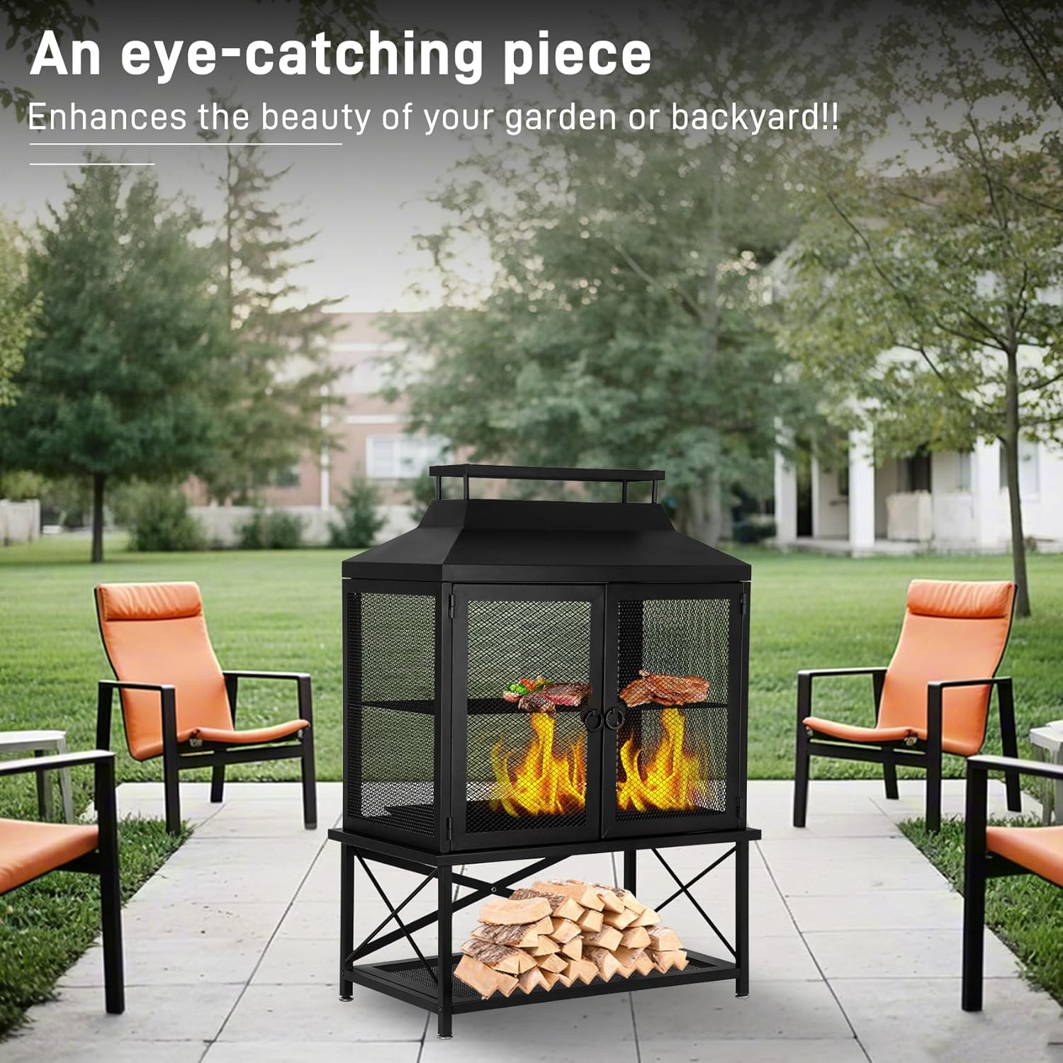 2-in-1 Metal Chiminea Fireplace with Grill,Wood Burning Outdoor Fireplace with Wood Storage, Metal Mesh Screen