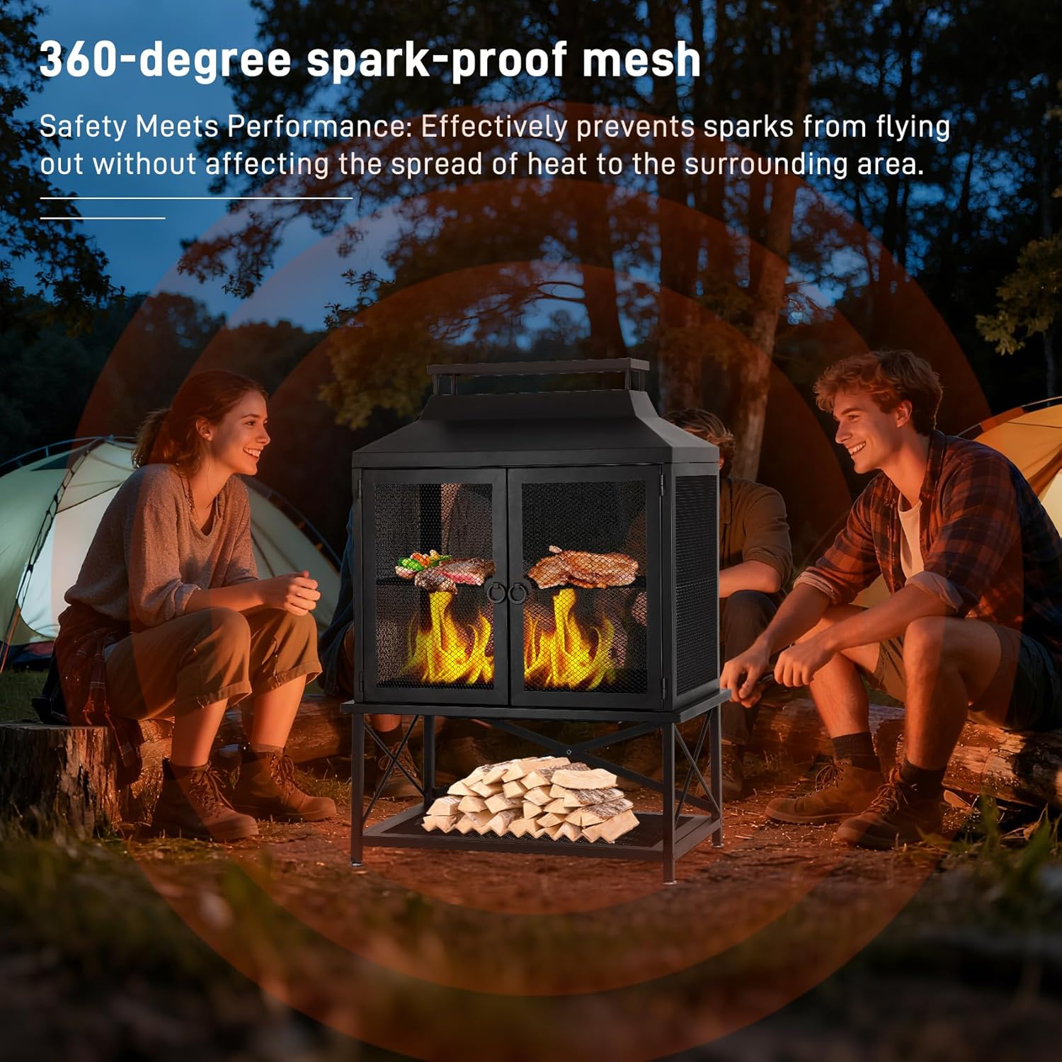 Secure and Sturdy Construction + Push-to-Lock Door BoltLarge Wood Burning Outdoor Fireplace Constructed from heavy-duty steel with a high-temperature resistant powder coating. Features a full-coverage spark screen and stable support frame to prevent tipping and contain sparks. Additionally, the fireplace door incorporates a push-to-lock mechanism for enhanced safety, preventing accidental opening