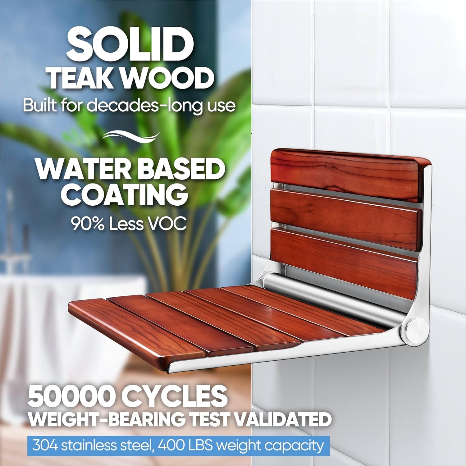 Upgraded 20\' Folding Teak Shower Seat Wall MountedEnhance your shower with this upgraded 20\'x17\' folding teak shower seat wall mounted. Made of solid Grade-A teak wood, this fold down shower chair combines luxury design, water resistance, and lasting performance for any modern bathroom.