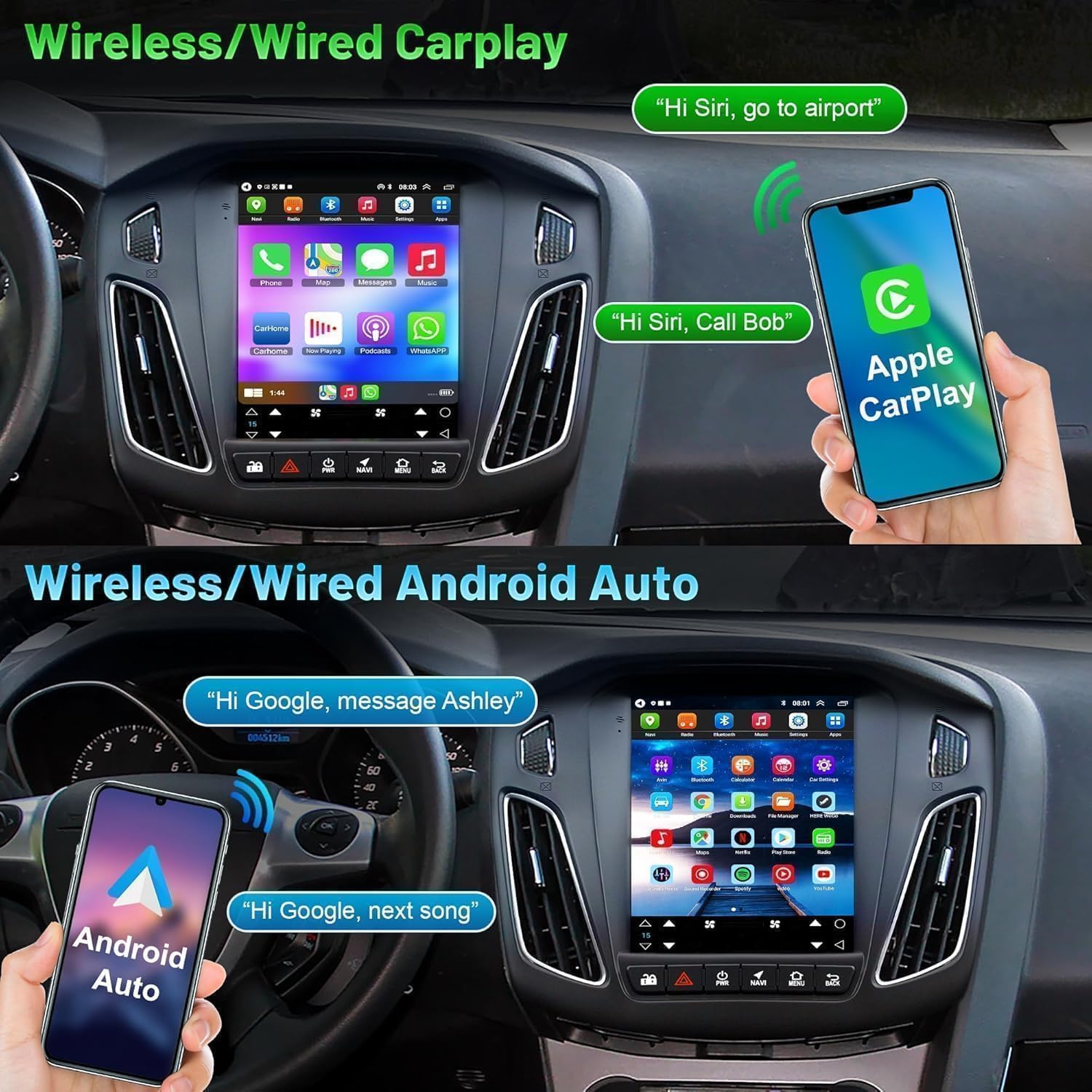 Wireless CarPlay and Android AutoThis Ford Focus Upgrade Replacement is compatible with wireless/wired CarPlay and Android Auto, you can make hands-free callings with the help of Siri or Google Assistant, and is easy to get phone contacts, emails, notifications, map navigation, music, videos and more. It means that you can focus more on road safety while driving.