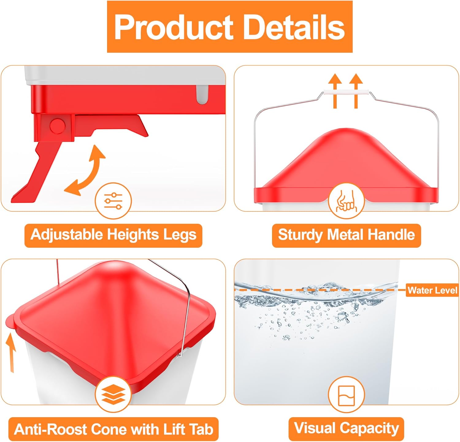 Anti-Roost Cone & sturdy metal handle: Prevents chicken from perching and blocks leaves or dust from falling into the bucket and contaminating the water. The sturdy metal handle makes moving effortless and smooth