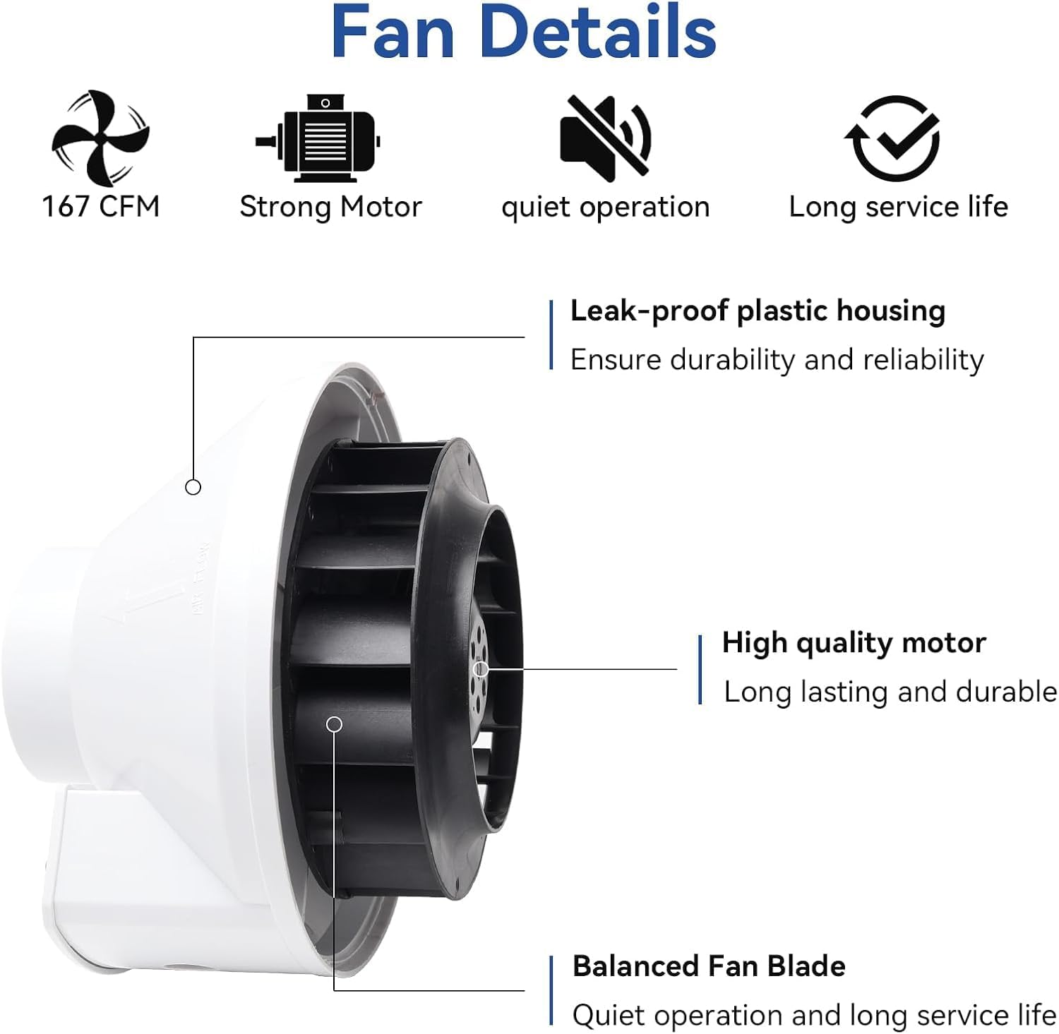 Durable Construction: The dryer duct booster fan features a leak-proof plastic housing that is water-resistant and dust-proof, effectively withstanding harsh weather conditions. It utilizes a commercial-grade motor for long-lasting performance and reliability