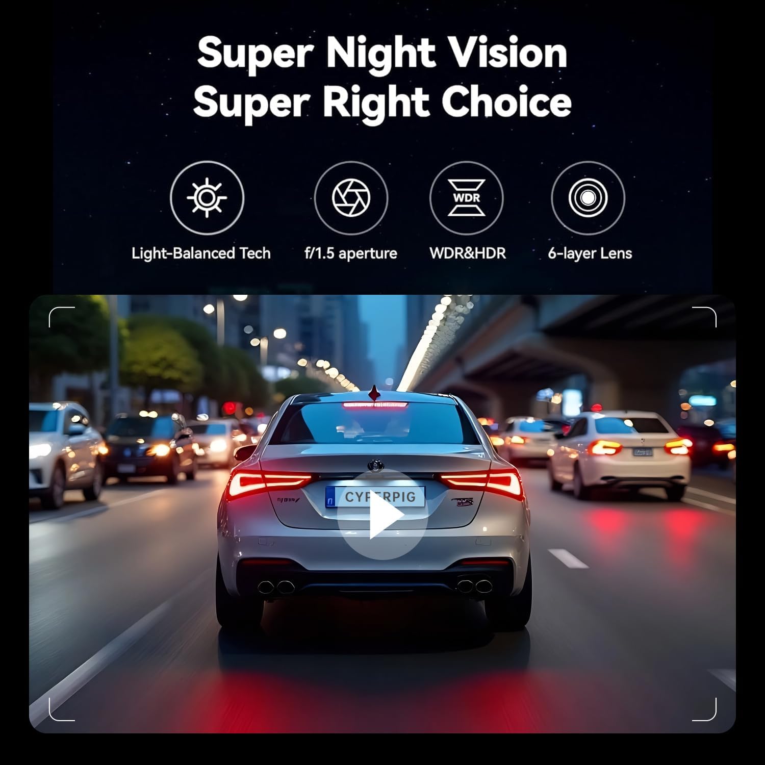 SUPER NIGHT VISION - CYPERPGI ULTRA CLEAR The Drive Recorder features an excellent optical lens with a large F1.5 aperture, 6-layer optics, and HDR/WDR technology to clearly capture important details in low-light conditions.