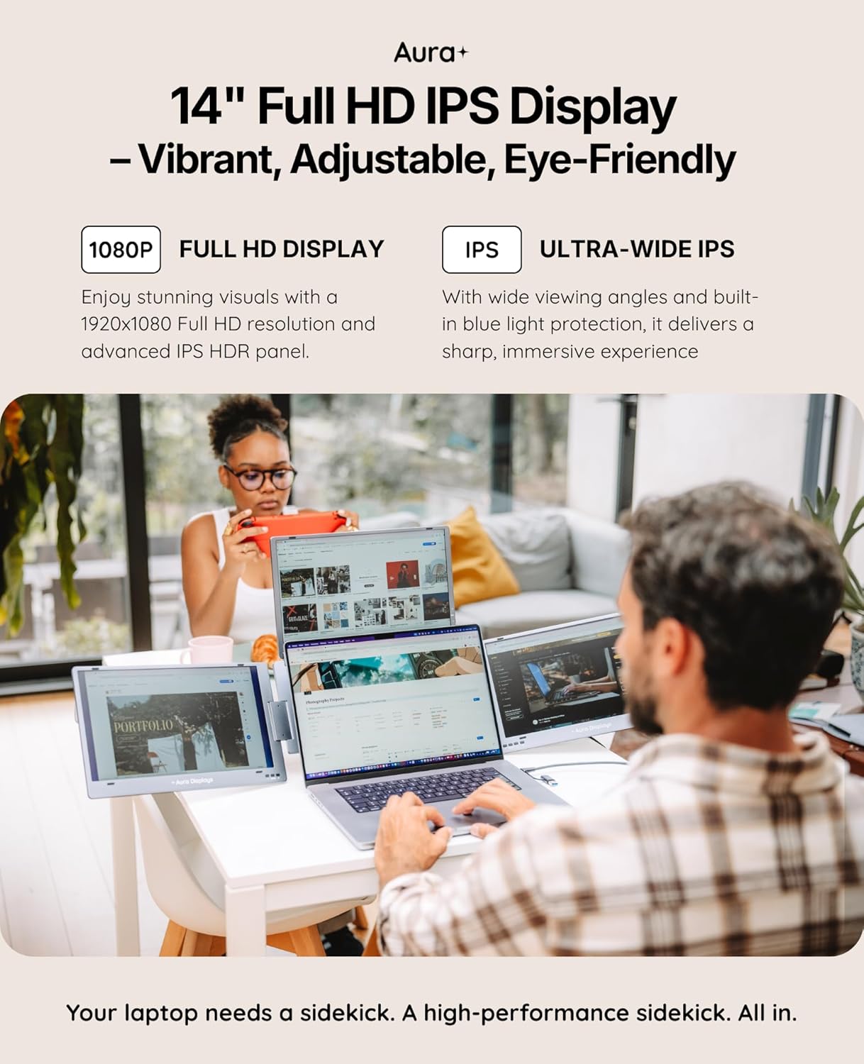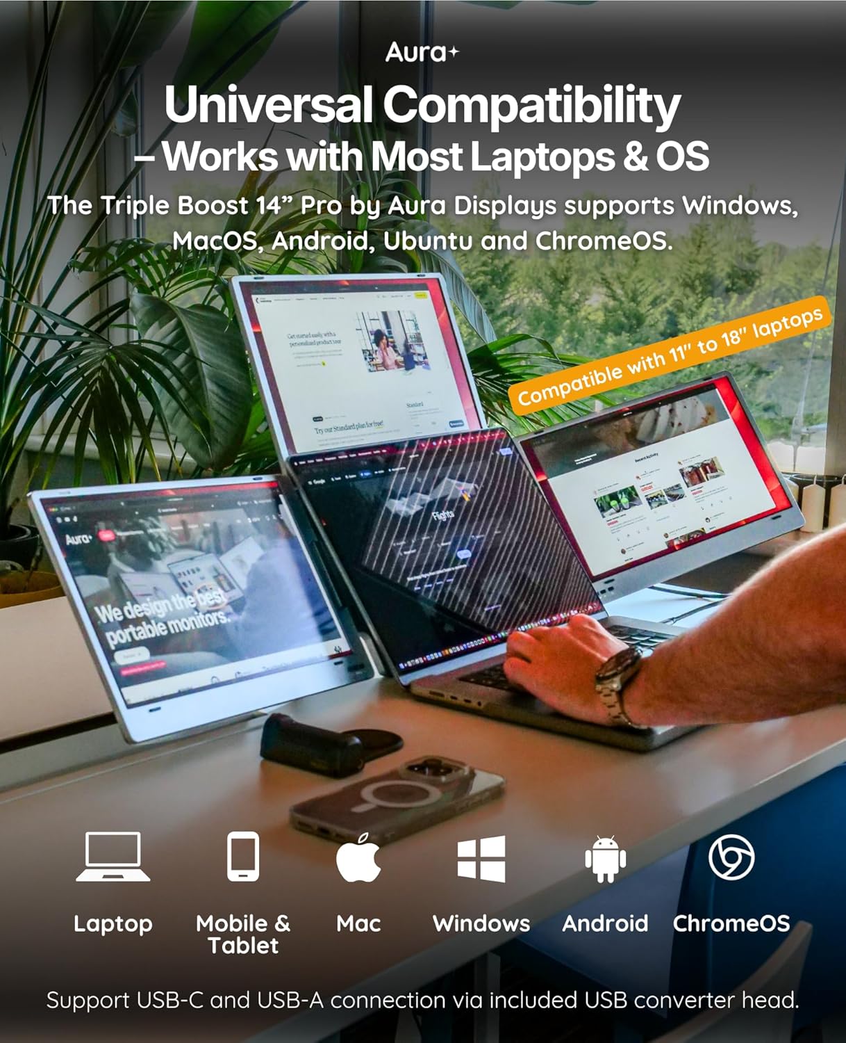 Triple Boost 14” Pro, Triple Portable Monitor Extender, 3×14” FHD 1080P HDR IPS, USB-C & HDMI, with 11”-18” Laptops