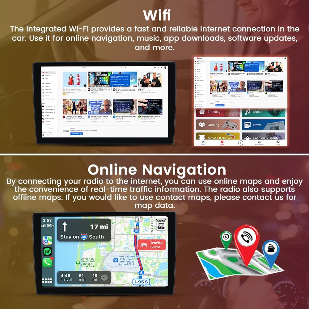 WiFi and NavigationThis car radio offers a powerful navigation function that supports both online and offline navigation. By connecting to Wi-Fi, you can use online navigation to receive real-time traffic information and route updates. To use offline maps, please contact us for further assistance