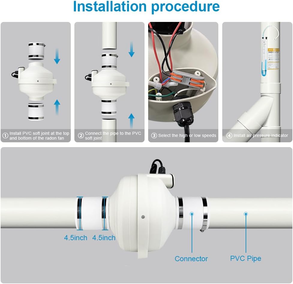 2-Speed Radon Fan - This upgrade radon mitigation fan offers two speed settings (280CFM and 188CFM). You can started with the higher speed for initial radon reduction, then switched to low for daily use to save energy. It runs very smoothly—no vibration, and the noise is minimal. From inside the house, you can barely tell it’s on