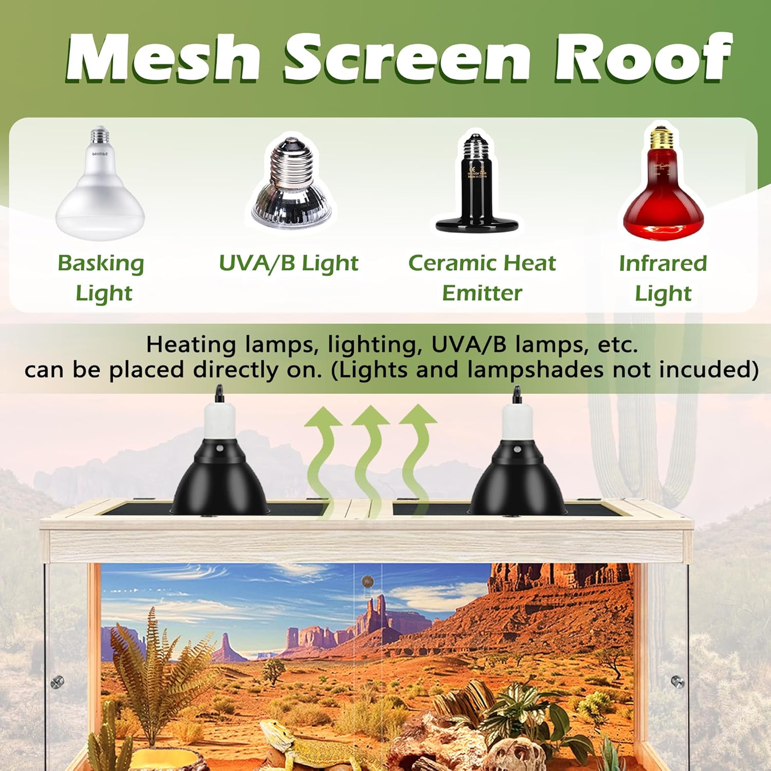 Open-Top Mesh for Lighting & HeatDesigned with a sturdy metal mesh top that opens easily for quick access, this enclosure provides excellent ventilation and compatibility with most heat lamps and light fixtures (lamps and bulbs not included). Simply place your heating or lighting setup directly above the mesh to create the perfect basking spot.