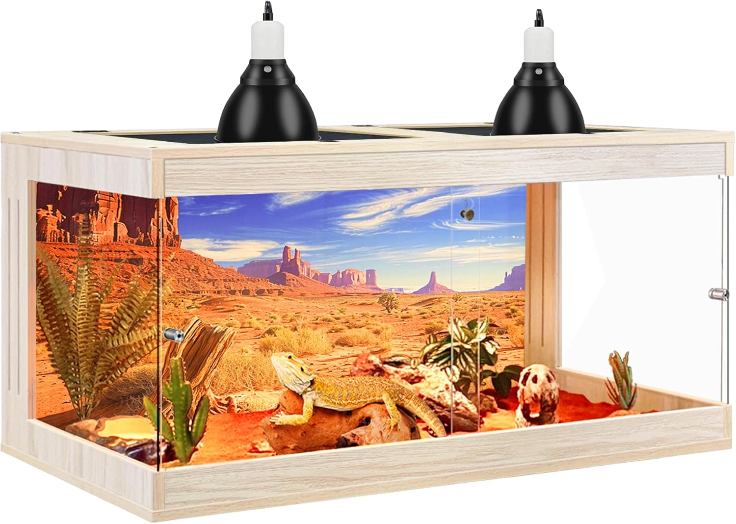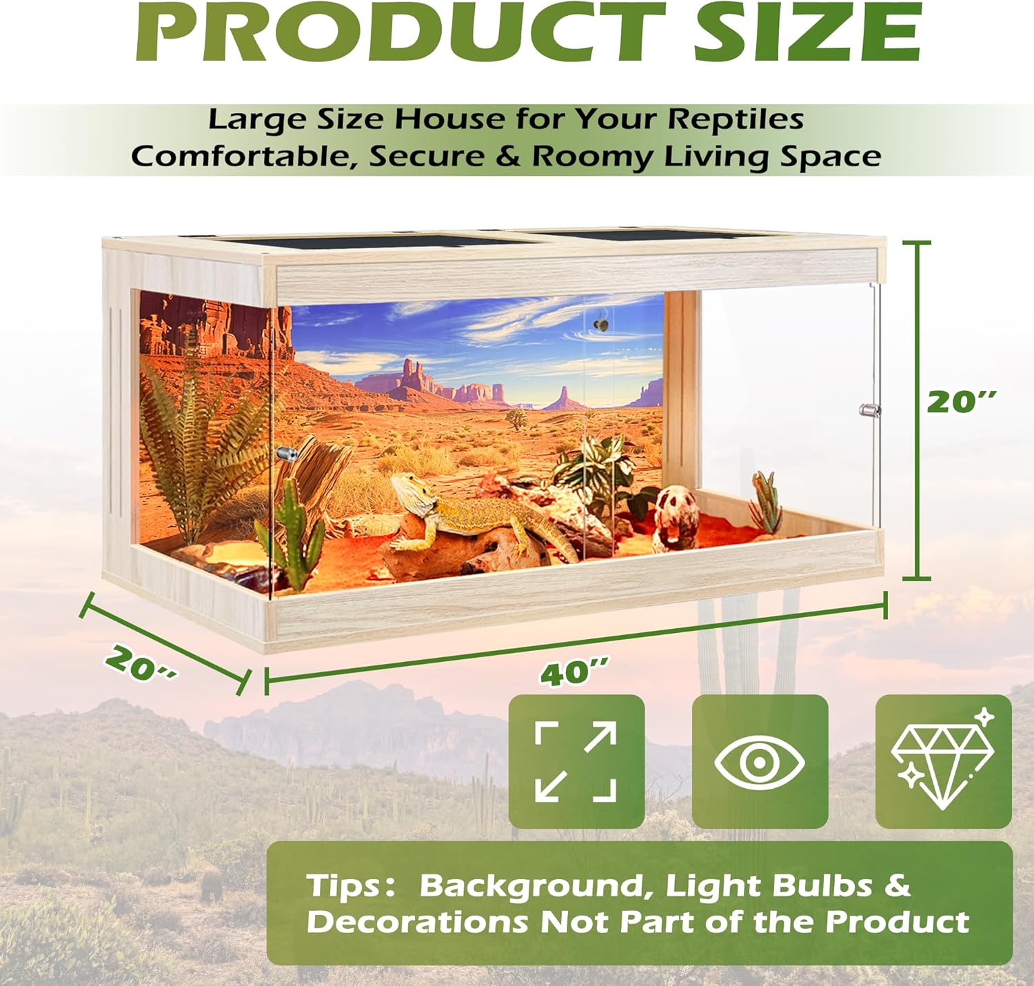 Durable Build & Premium MaterialsBuilt to last, this reptile terrarium is crafted from sturdy tempered glass and natural wood with a waterproof coating for long-term use. The durable construction combines modern aesthetics with practical protection—featuring a waterproof acrylic base panel that shields against spills and moisture to keep the habitat clean, dry, and well-maintained.