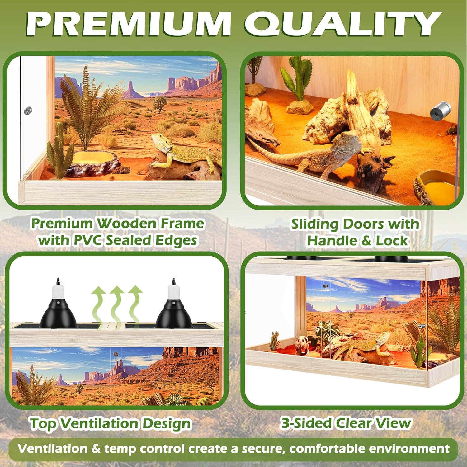 Bearded Dragon Tank, Tempered Glass, Terrarium with Metal Mesh Top, 3-Side Clear Anti-Scratch Glass, Oak,60 Gallons
