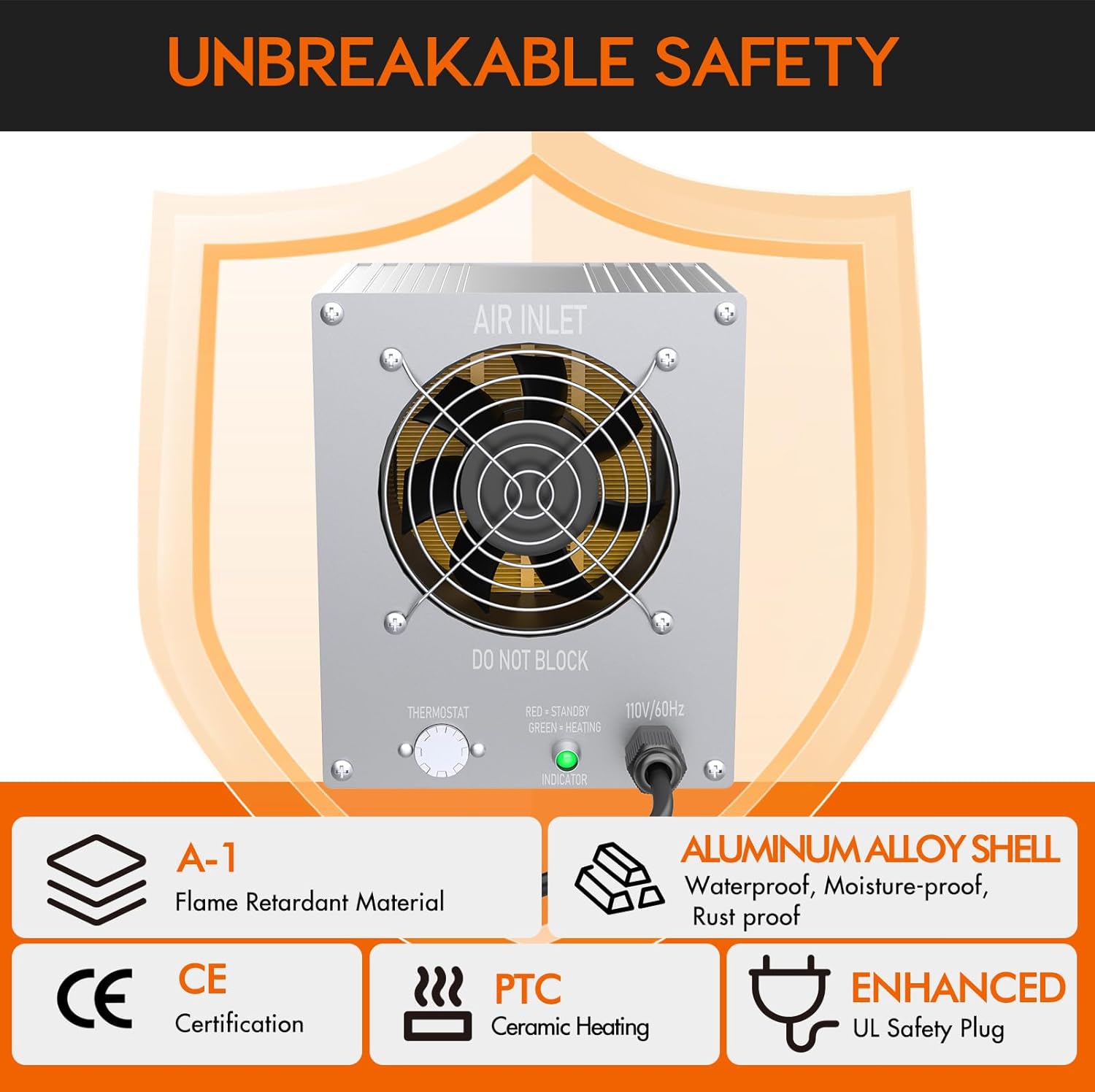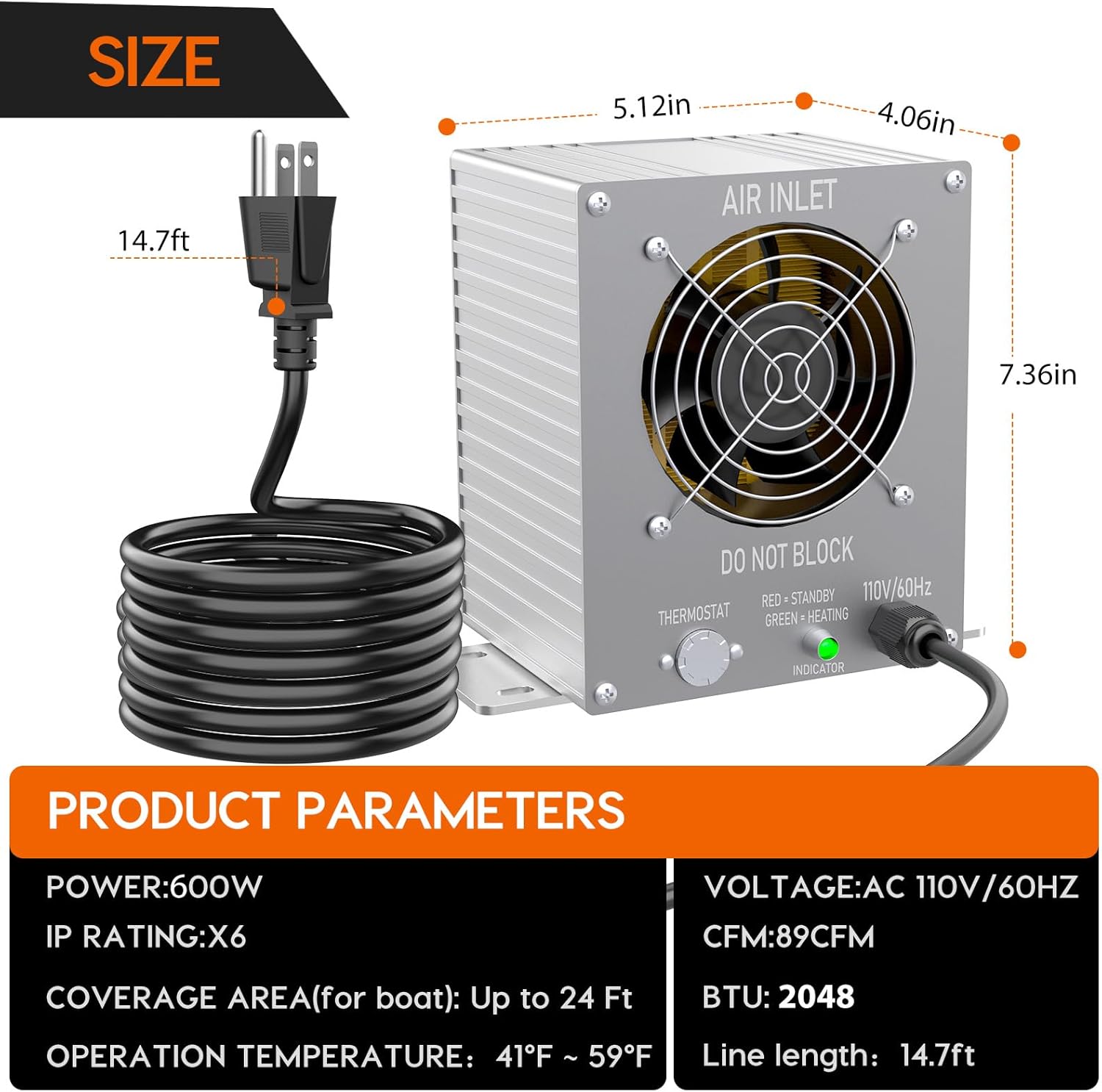 2026 Upgraded Boat Cabin Heater:Experience the power of advanced PTC ceramic heating technology! This heater expertly combines PTC heating elements with aluminum tubing for minimal thermal resistance and maximum heat exchange efficiency. The newly upgraded internal fan delivers an impressive airflow of 89 CFM, providing faster heating than ever before. Plus, with a UL-certfied 4.5m power cord, you can trust in safe and reliable operation for all your heating needs!