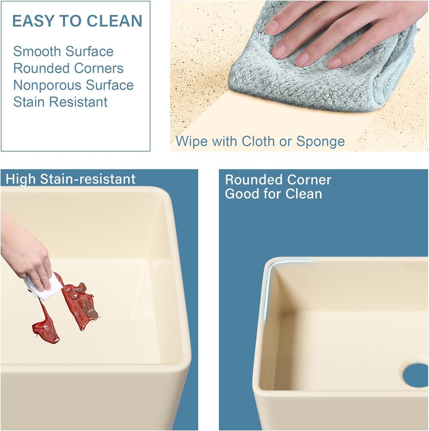 Easy to CleanThe smooth bone surface of the farmhouse sink makes it difficult for food residue to adhere, We can clean the apron sink with sponge or cloth. and thanks to the rounded corners of R10, This farm sink for kitchen is very easy to clean.