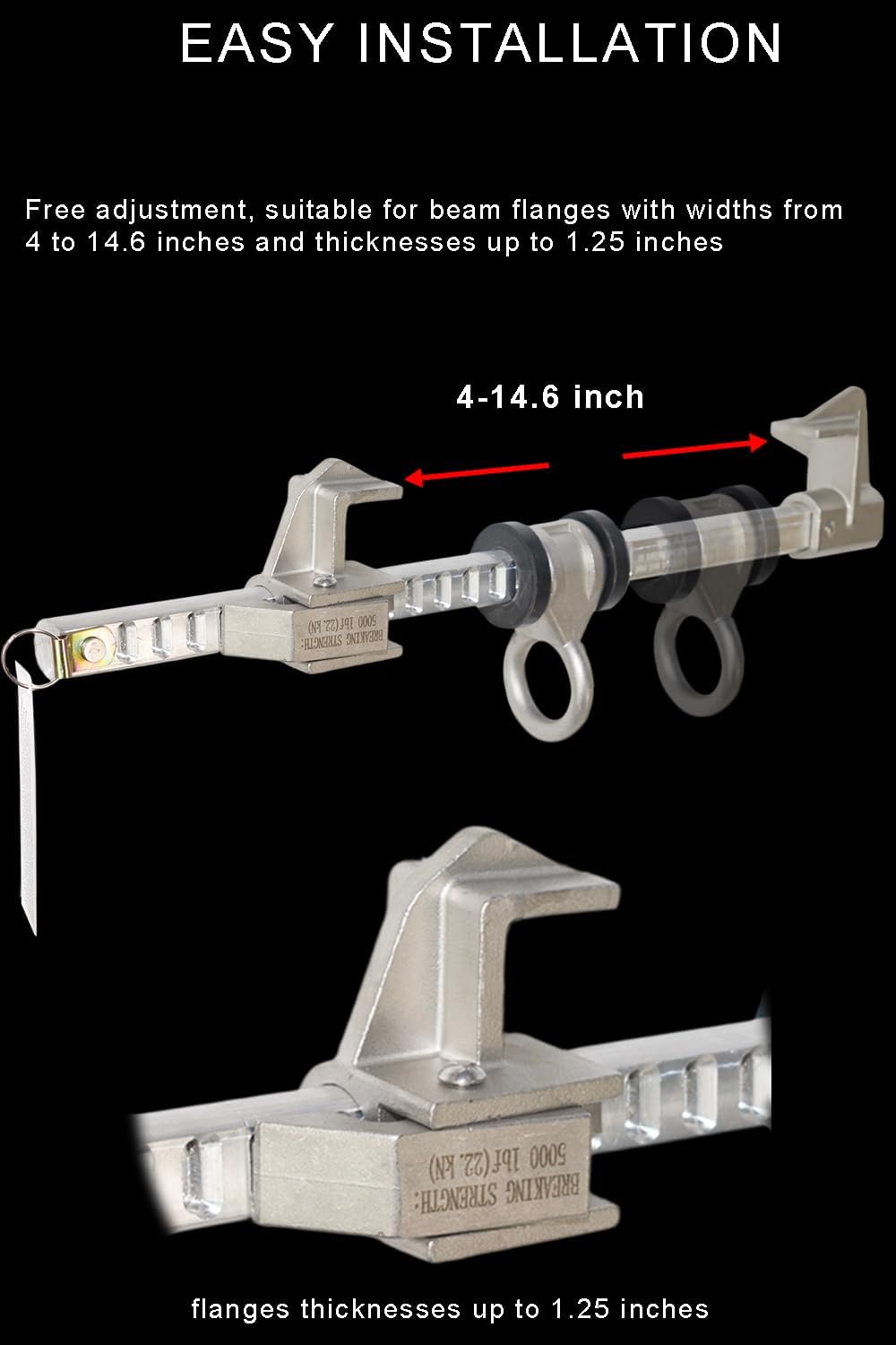 EASY INSTALLATION: Free adjustment, suitable for beam flanges with widths from 4 to 14.6 inches and thicknesses up to 1.25 inches.