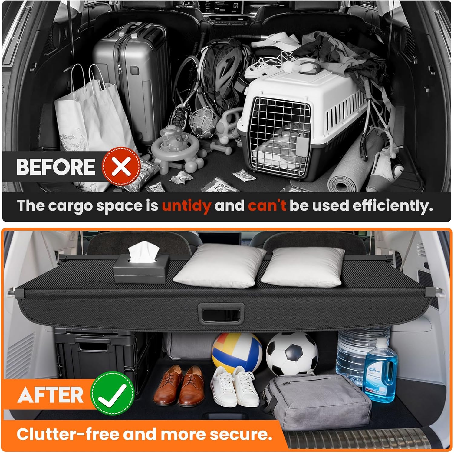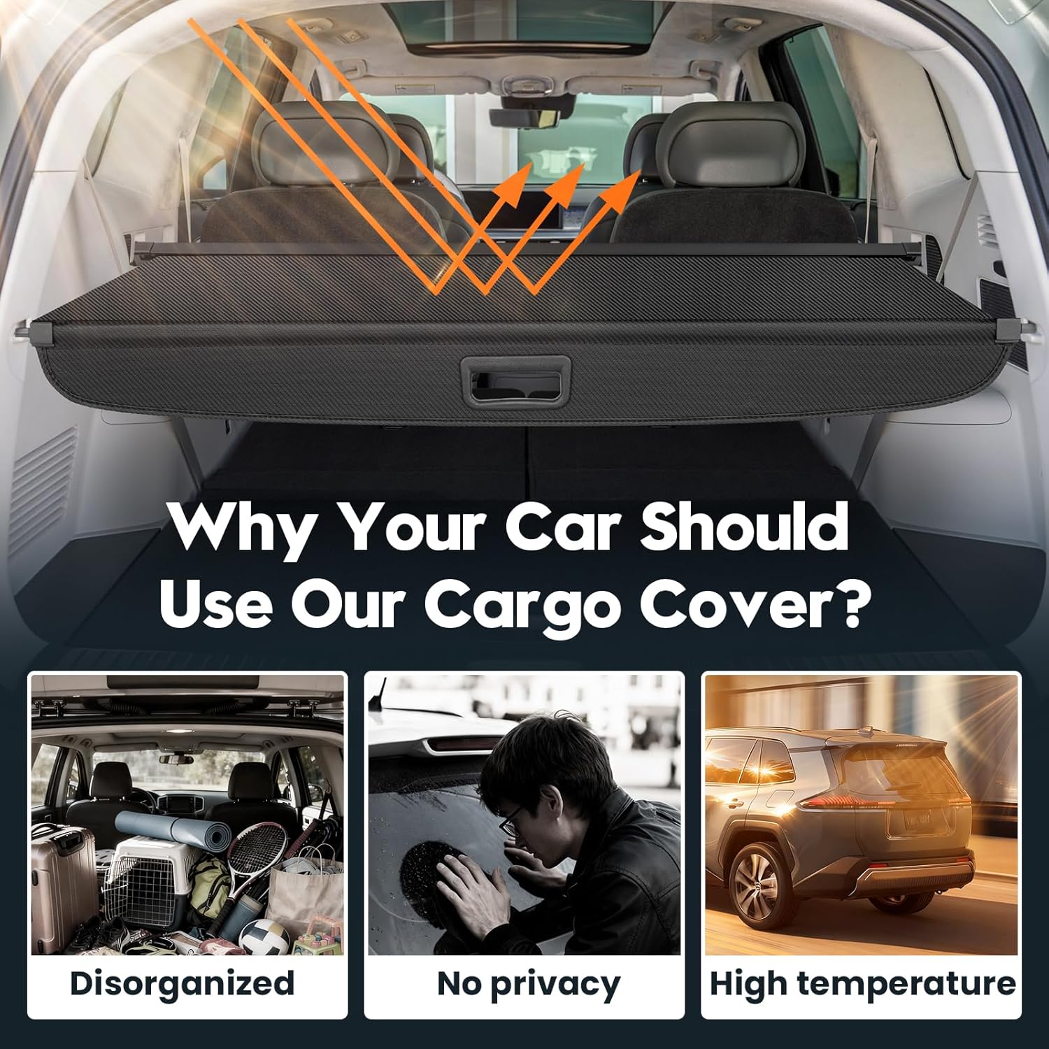 Ultimate Sun Protection---Our cargo cover provide exceptional UV protection, blocking harmful rays to keep your vehicle`s interior cool and prevent fading of upholstery, ensuring a comfortable ride for you and your passengers.