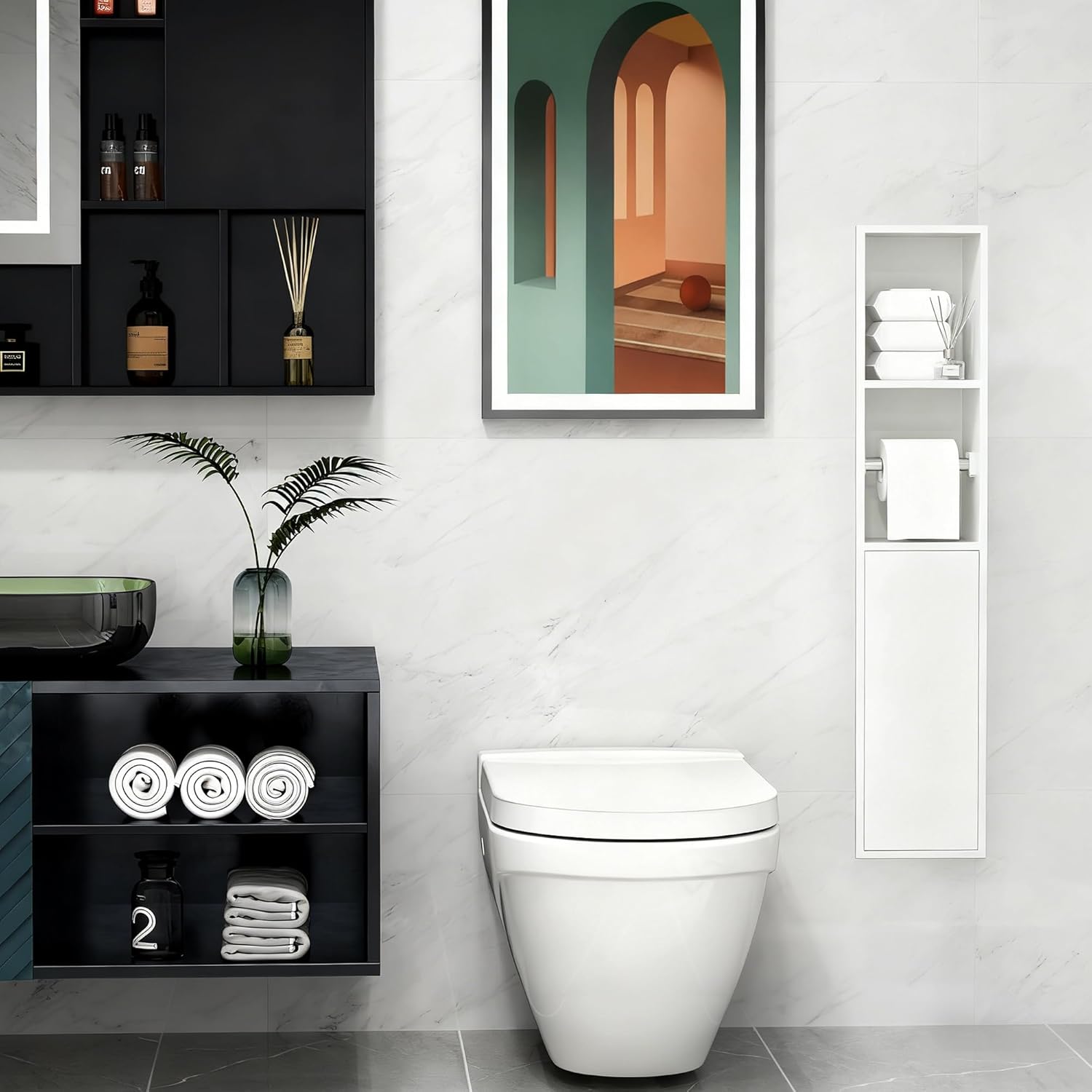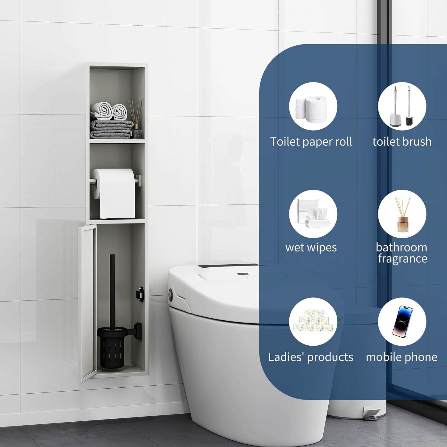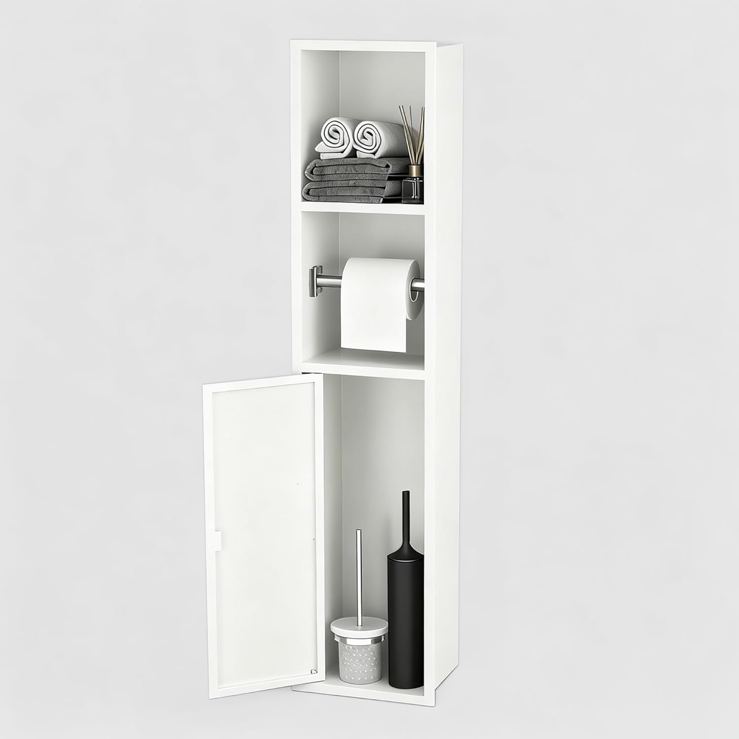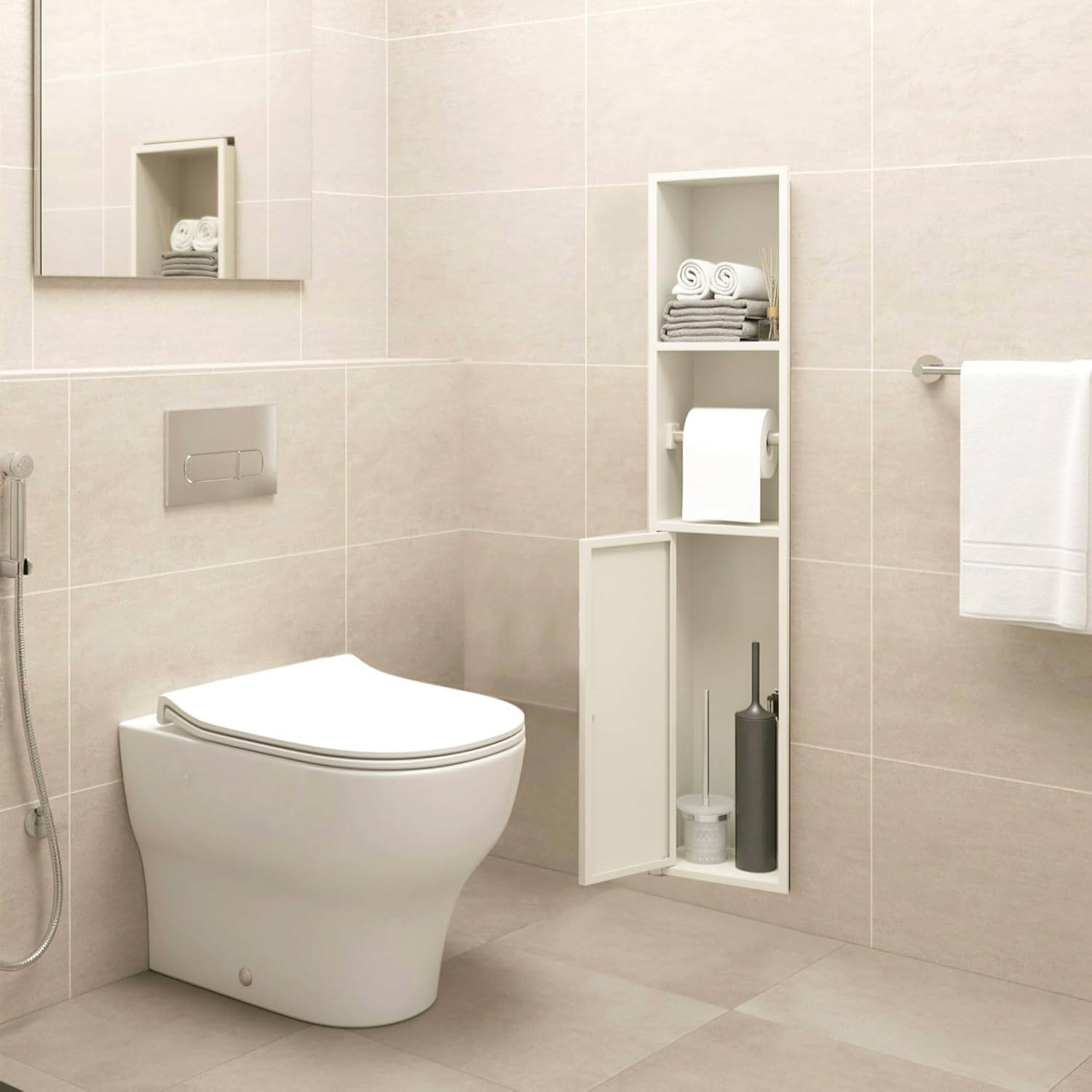 Concealed Cabinet Functionality: Features push-to-open hidden storage in this recessed toilet paper niche. The enclosed toilet paper cabinet with shelf completely conceals contents when closed, toilet paper holder insert maintaining clean lines in any bathroom wall niche installation