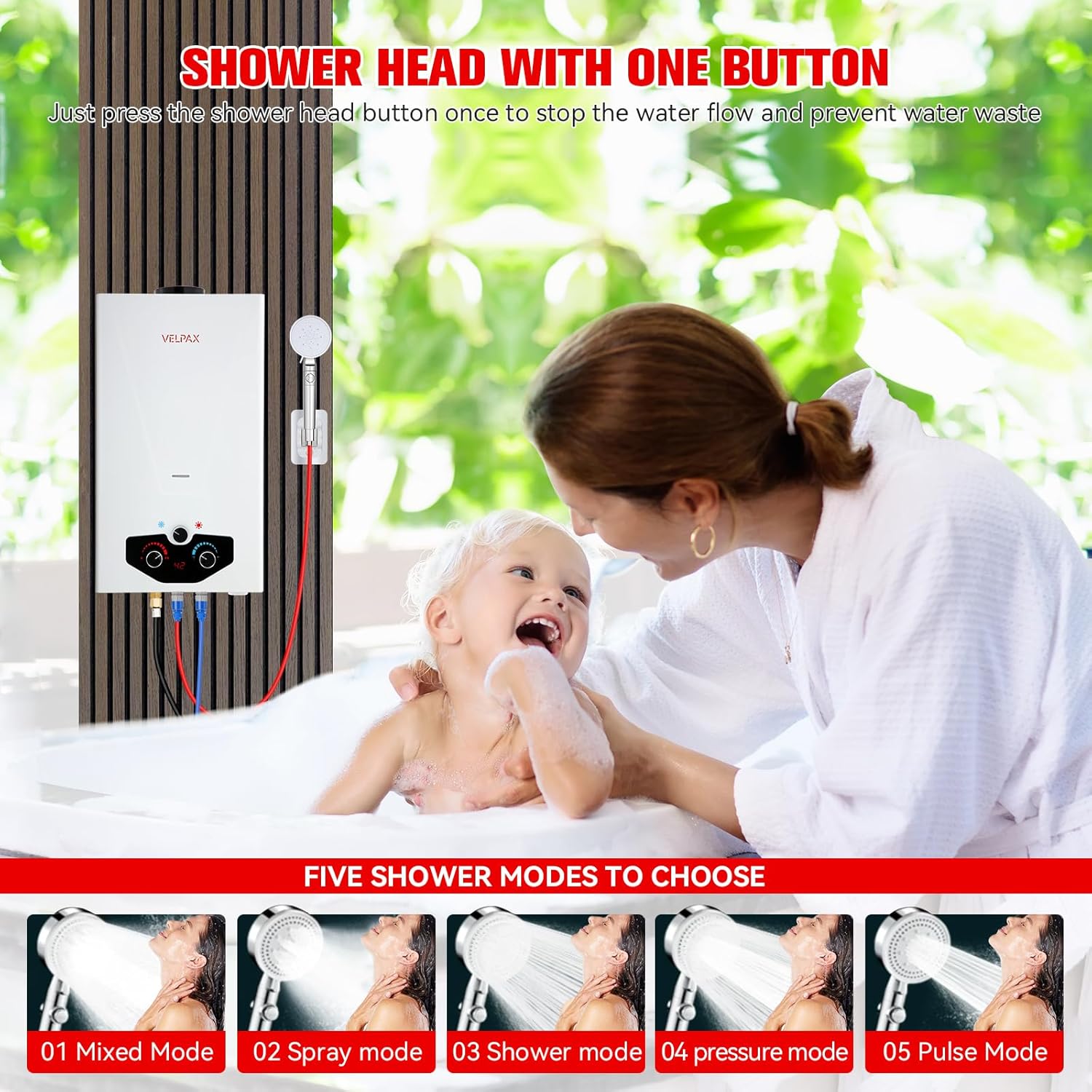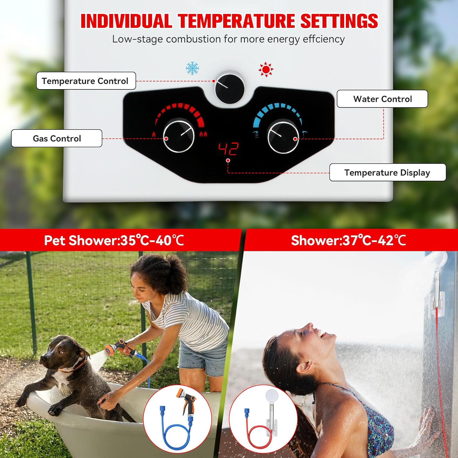 Complete Accessories - This tankless water heater comes with a CSA-approved 5FT gas regulator and a high-pressure shower head with 5 spray modes. Also included are a 8 spray pet showerhead, a 2GPM water pump with dual power options (10ft alligator clip cable and 23ft cigarette lighter cable), 4 pipe adapters, and 2 hoses. The dual power options for the water pump allow for flexible charging and usage, whether you`re near a vehicle or using a battery setup.