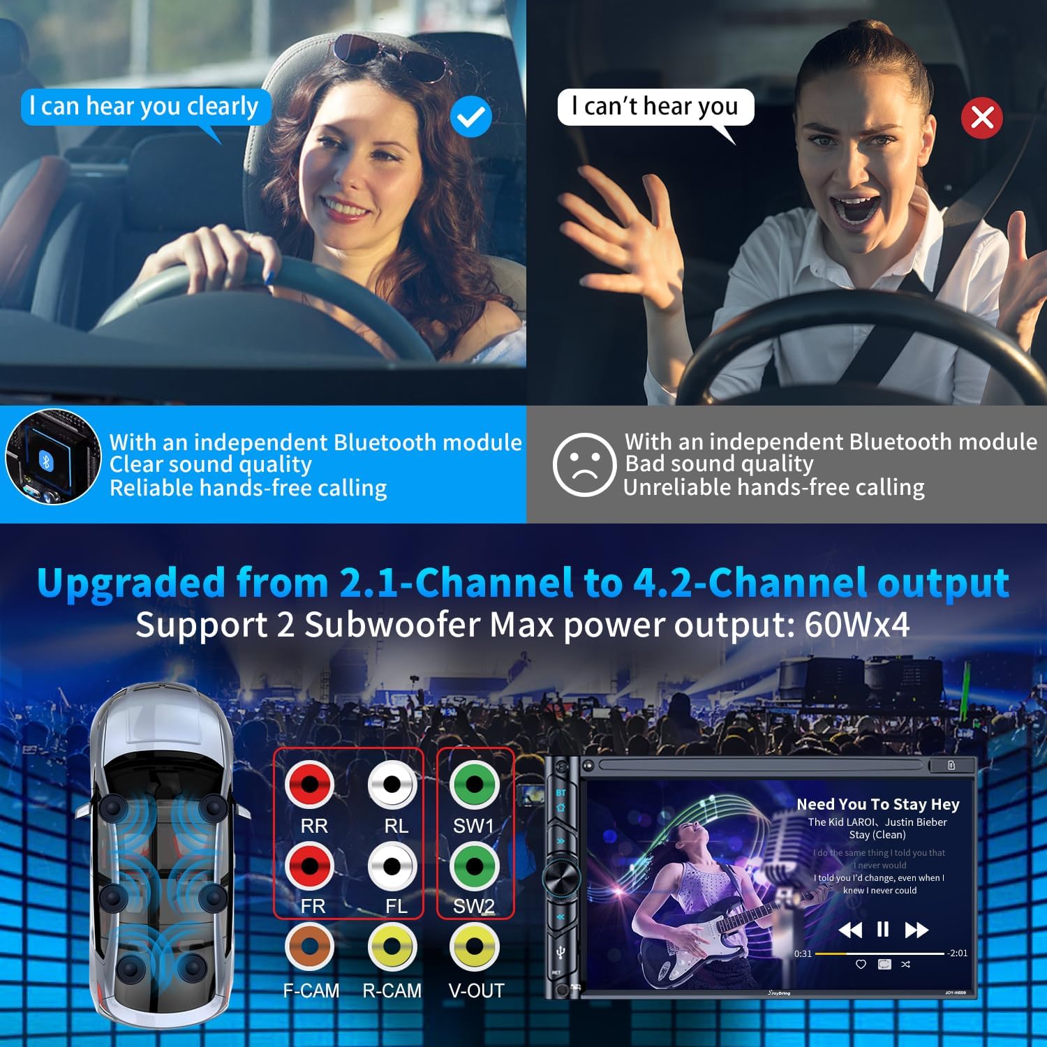 Support 4.2 Channel Output: This car stereo supports 4.2 channel output. (Rear Right/Left Speaker output, Front Right/Left Speaker output and 2 High RMS Power Subwoofer output.) You can enjoy the outstanding sound quality and breathtaking bass effects. It is equipped with tone control function that allows you to adjust the music effect. Made with high-quality materials and advanced technology, it is stable and durable. Perfect for music enthusiasts and drivers who enjoy music in their cars.
