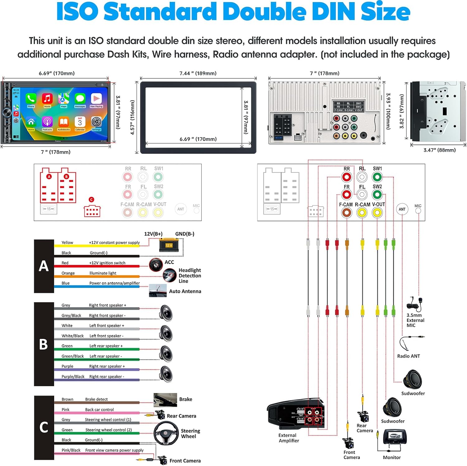 Please Check Your Car Before BuyingThis standard double-DIN car stereo fits most vehicles. It requires a minimum dashboard opening of 6.69\' x 3.81\' and includes an extra frame (7.44\' x 4.61\') for adjustment. Please verify your vehicle`s dashboard opening, wiring harness, and antenna adapter are compatible before purchase, as you may need to buy additional parts.
