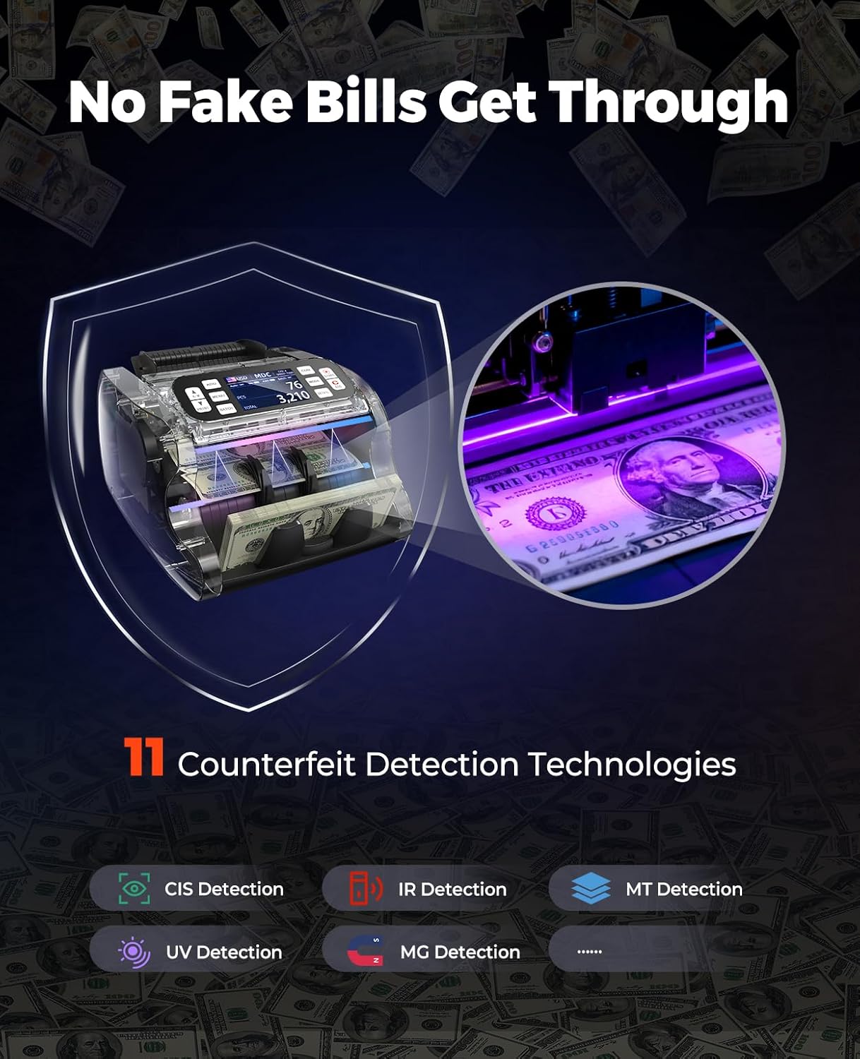 [Bank-Grade Counterfeit Detection] Equipped with advanced CIS, UV, MG, IR, and MT sensors, this money counter performs 11 layers of security checks including magnetic ink verification, infrared analysis, and image recognition. It accurately detects counterfeits, superdollars, and even worn or slightly damaged bills, ensuring every note is verified with precision. Designed for banks, casinos, and high-volume cash businesses, it delivers unmatched accuracy, reliability, and peace of mind with every count.