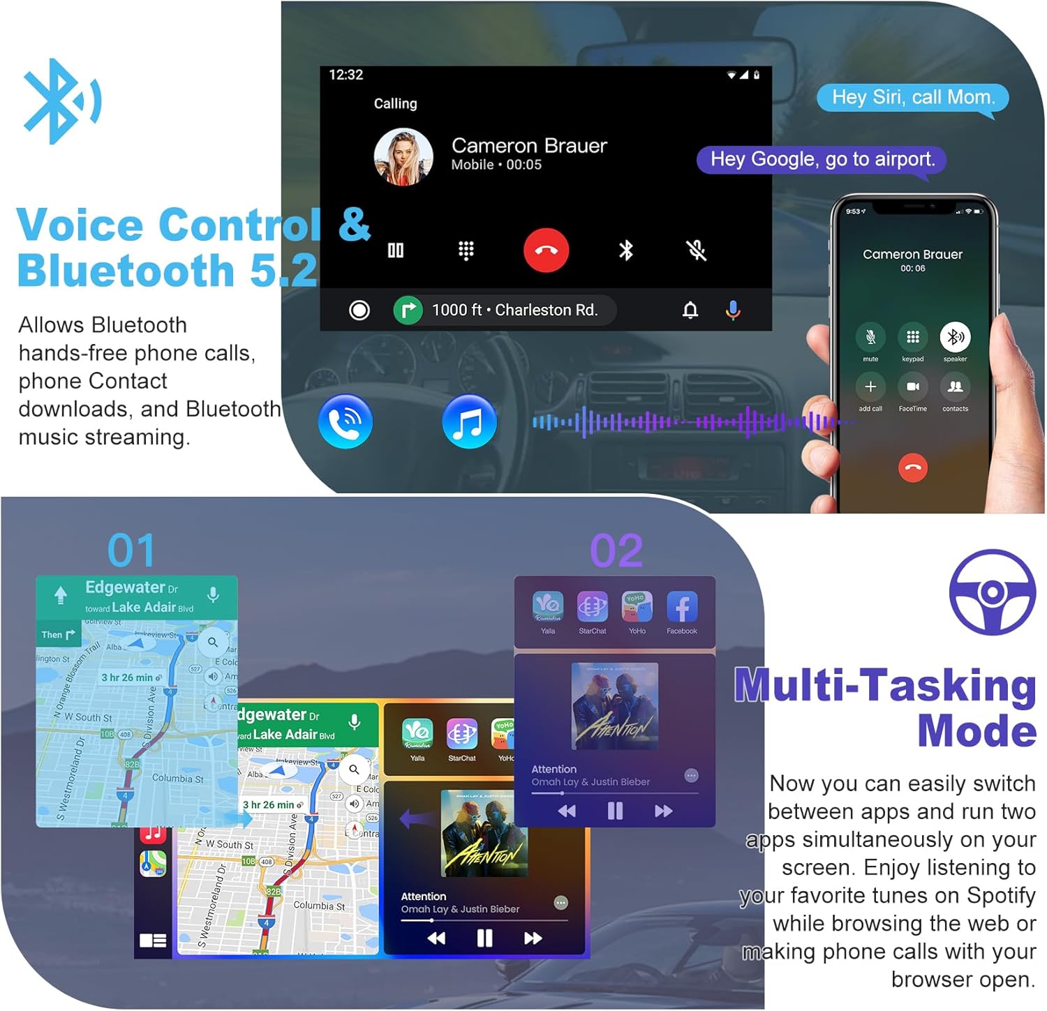 Bluetooth 5.2 & Steering Wheel Control:Crystal-clear hands-free calls with built-in mic and speakers. Bluetooth 5.2 ensures stable connections, while steering wheel controls let you adjust volume, tracks, and calls without taking your hands off the wheel—safer and smarter driving.