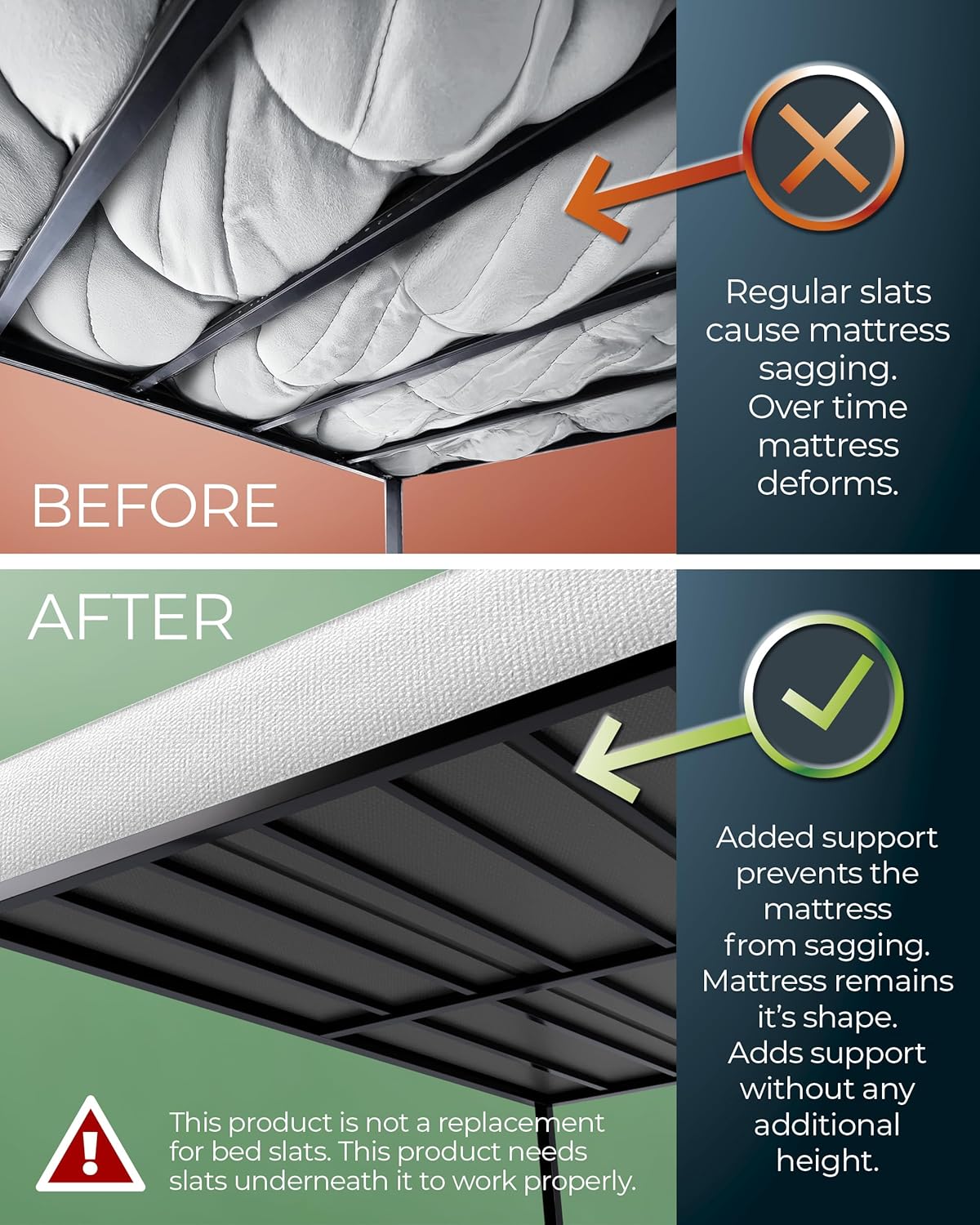 ELIMINATES SAGGING & ENHANCES COMFORT - Reinforces soft spots between slats to prevent sagging. Creates a stable sleep surface that preserves mattress shape—ideal for foam, hybrid, or innerspring beds.