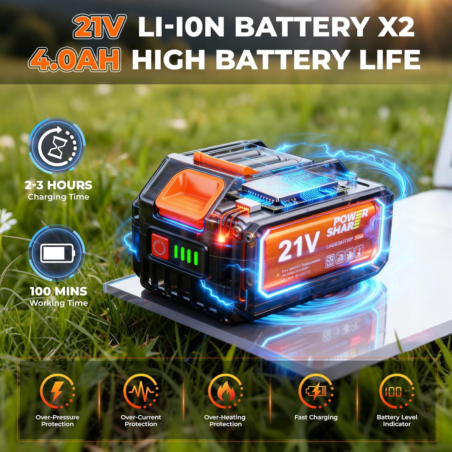 Dual 21V BatteriesIncludes 2×21V 4.0Ah Li-ion batteries for up to 100 min runtime. Work freely anywhere—no extension cords needed, fast charging with full safety protections with power indicator
