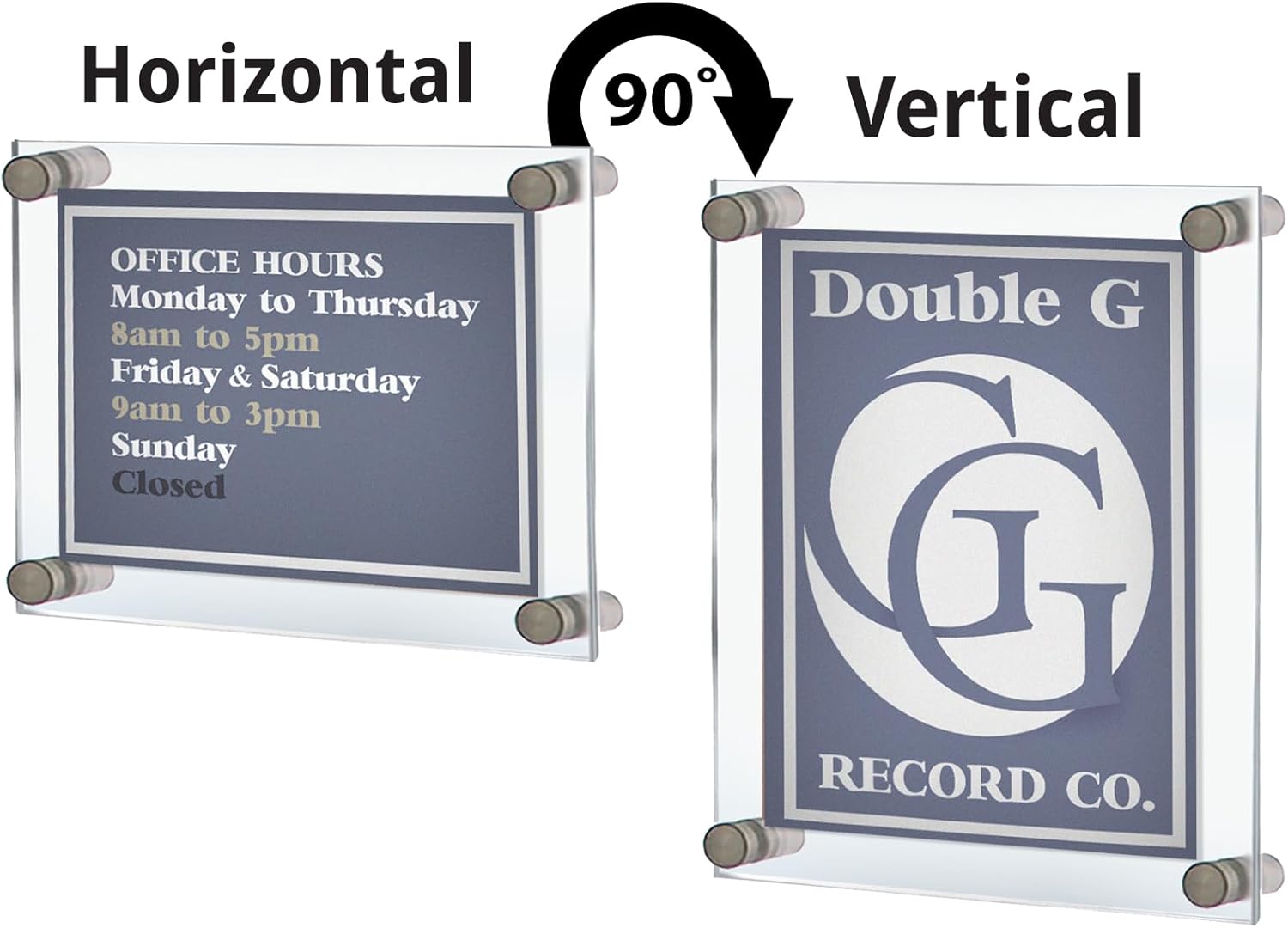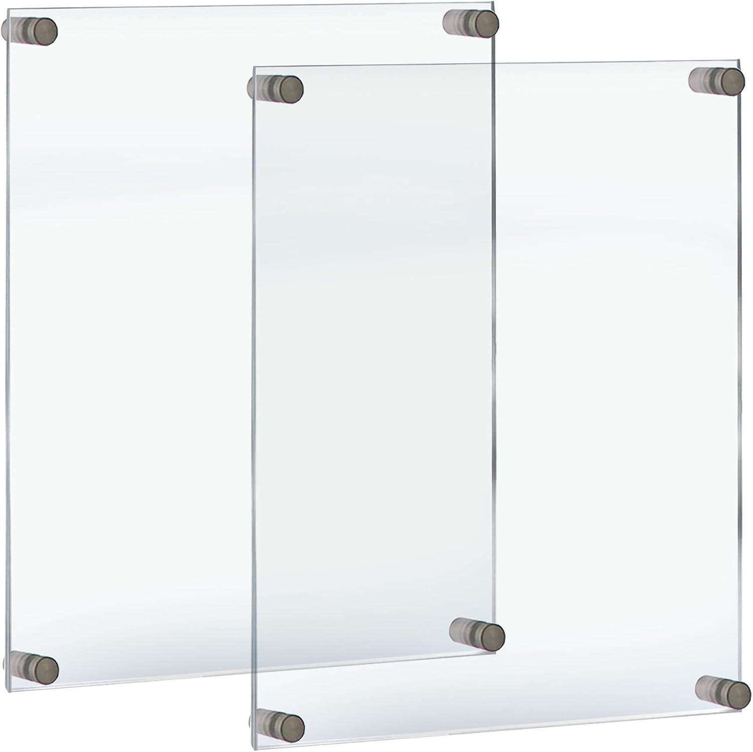 HARDWARE INCLUDED - Each floating sign holder frame set includes 2 acrylic panels that are 3/16” thick, 4 silver standoff caps and hanging hardware. Note: Large format sizes: 24” x 36” and 30” x 40” include 6 standoffs and caps.