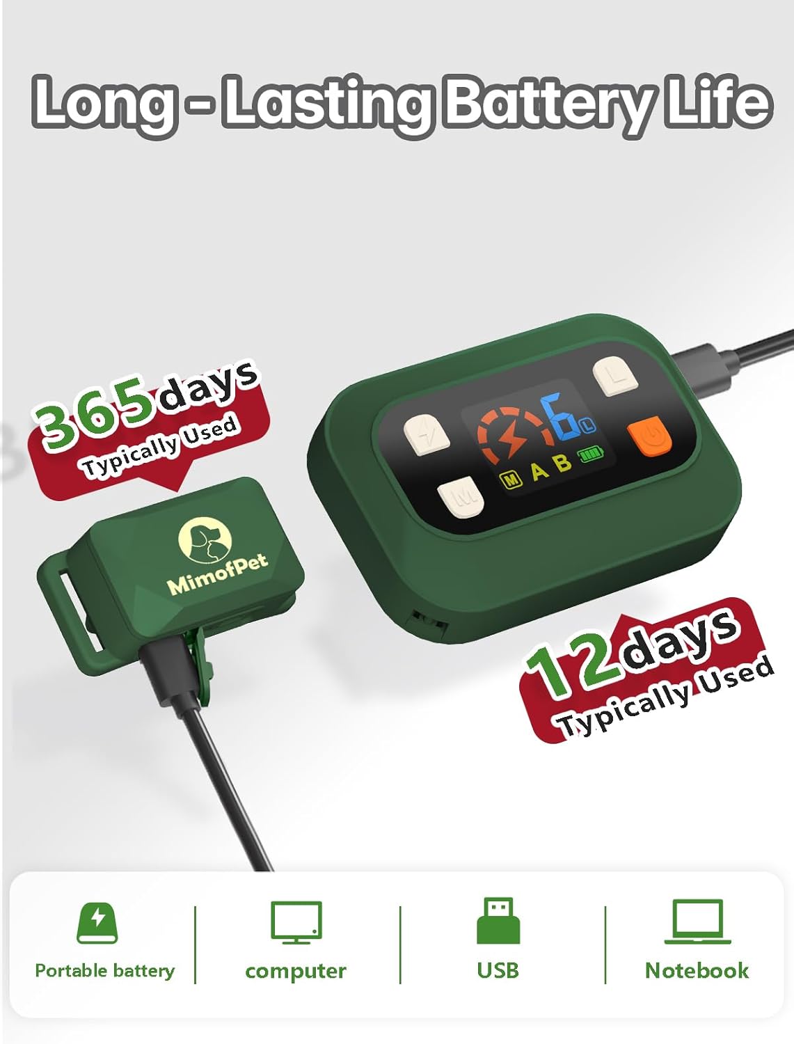 Long-Lasting Rechargeable Battery:Say goodbye to constant battery changes! MIMOFPET indoor wireless pet barrier is fully rechargeable, with the transmitter lasting up to 12 days and the collar up to 365 days on a single charge. Enjoy uninterrupted pet control without needing power outlets.