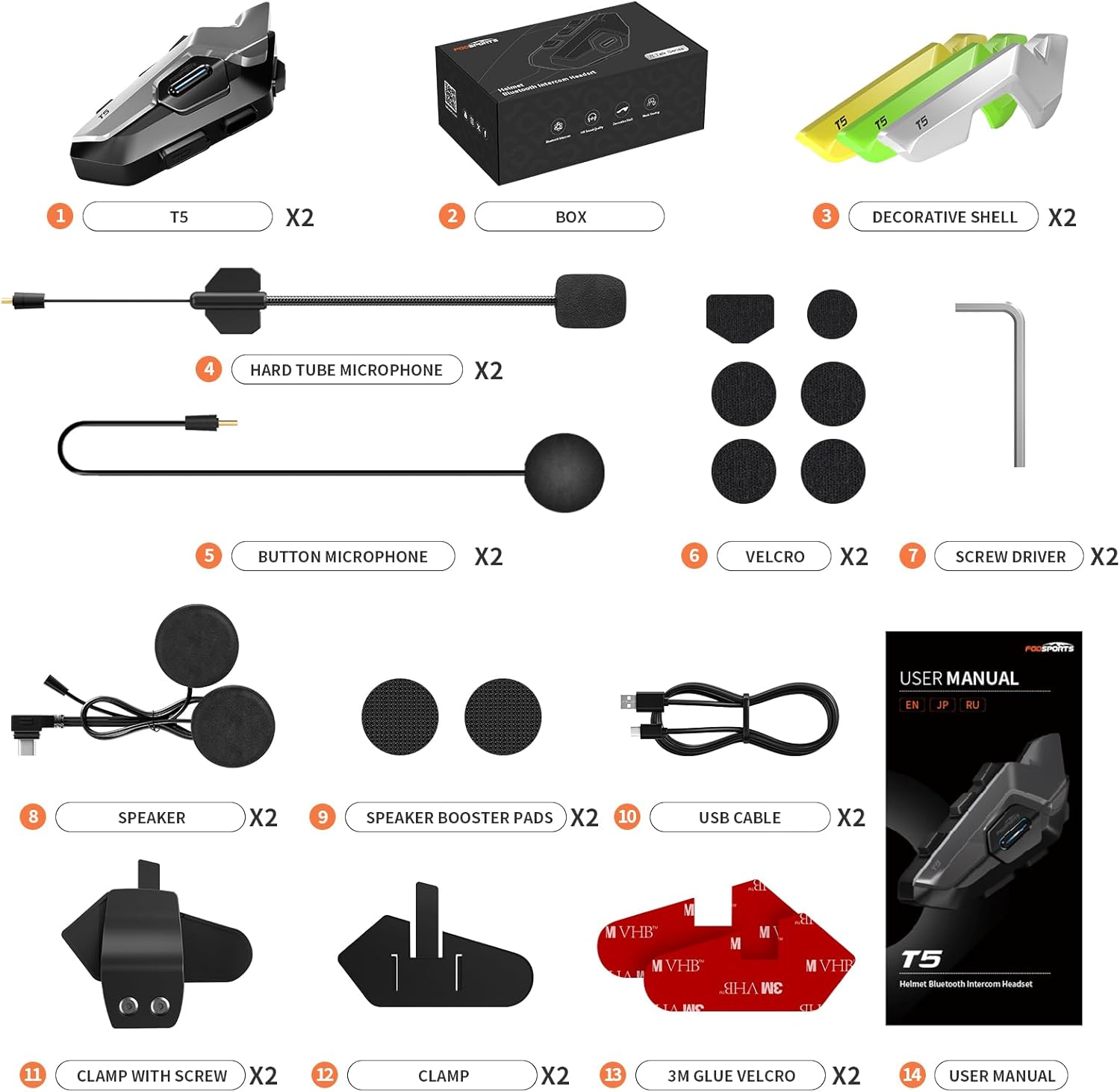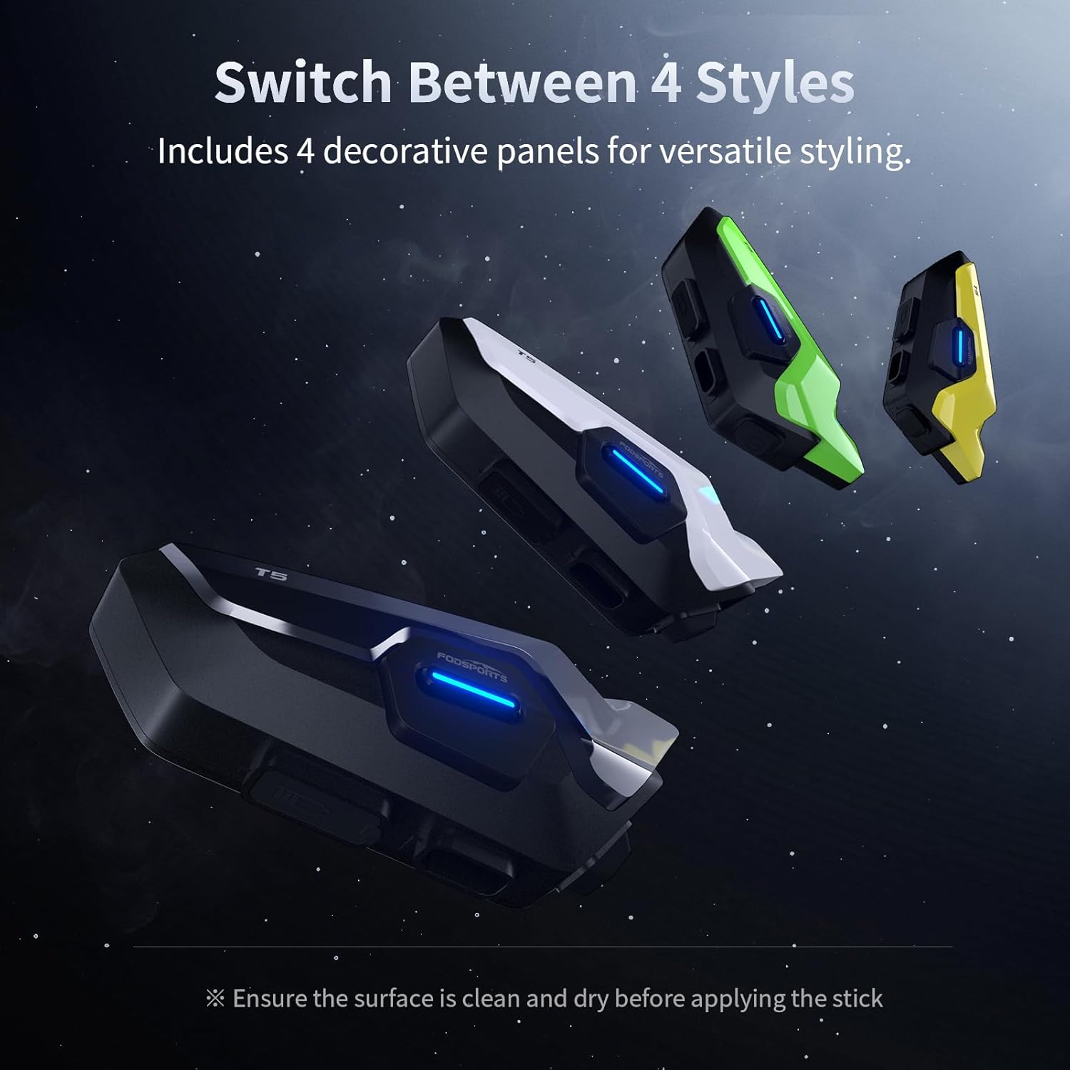 Customizable Style & Universal Compatibility: Includes 4 colored faceplates and two mic types for full-face, modular, or open-face helmets—ensuring a perfect fit. The T5 works with virtually any helmet and comes as a complete set for instant rider-to-rider pairing