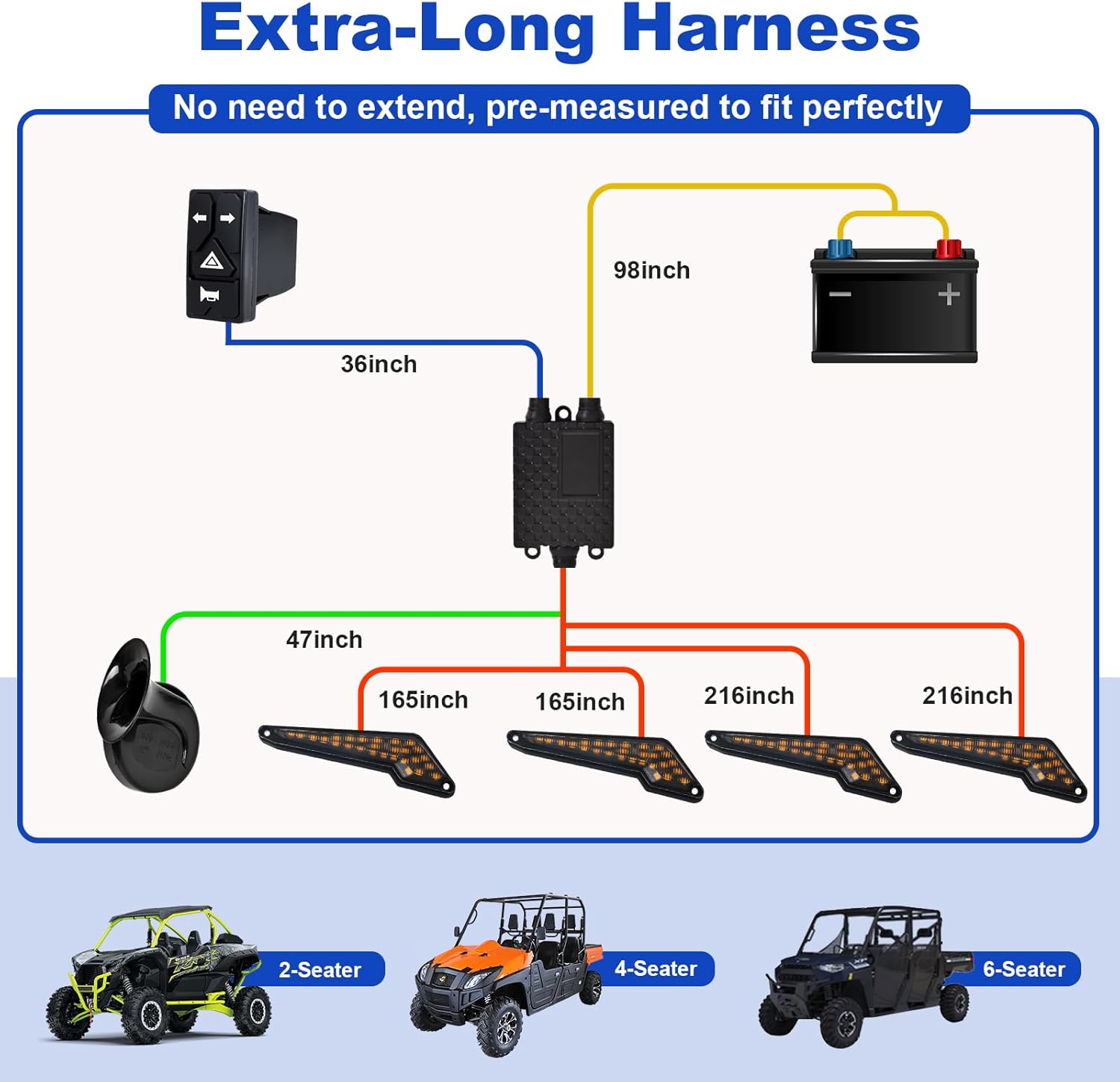 Optimize harness length & Plug-and play Design: Pre-wired with extended cables (fits vehicles up to 220 inches)for easy to install on 2/4/6-seater, no-splice.Thicker wires ensure stable current flow. Preassembled wiring harnesses and marked light connectors positions which make installation more easier and quickly.