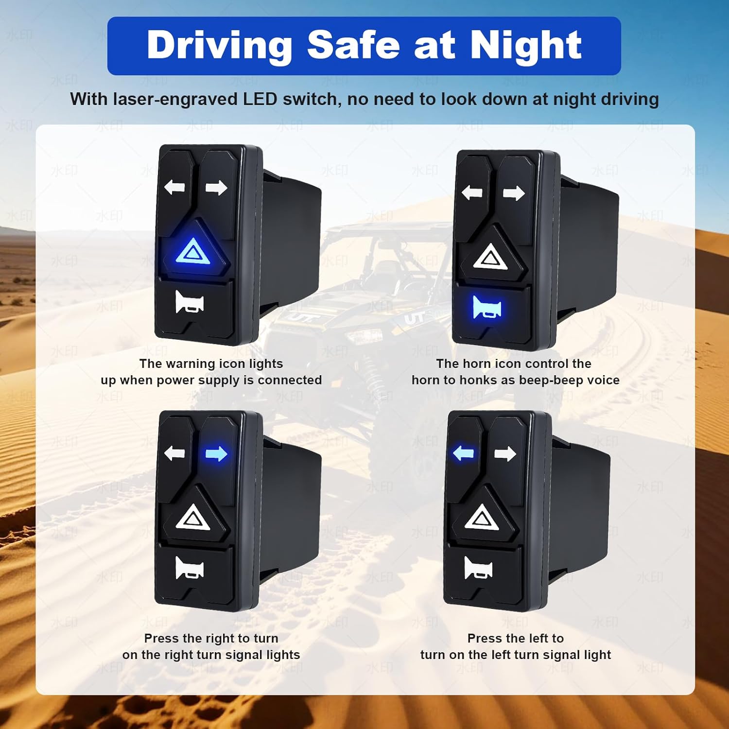 Upgrade 4-in-1 Rocker Switch:Combined Left/Right/Hazard/Horn Switch function together,it is more convenient to control switch while driving.Also with laser-etched LED switches, no need to look down while driving at night.