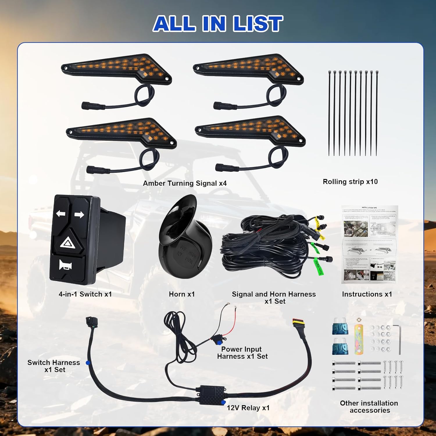Package Includes: The turn signal kit features with color-coded markings for easy to install. The kit includes accessories: Triangular amber turn signal lights x4, Horn x1, Left/Right/Hazard/Horn 4-in-1 Rocker Switch x1, Harness set x1, Relay x1, Cable Ties x1 set, Installation Guide x1.