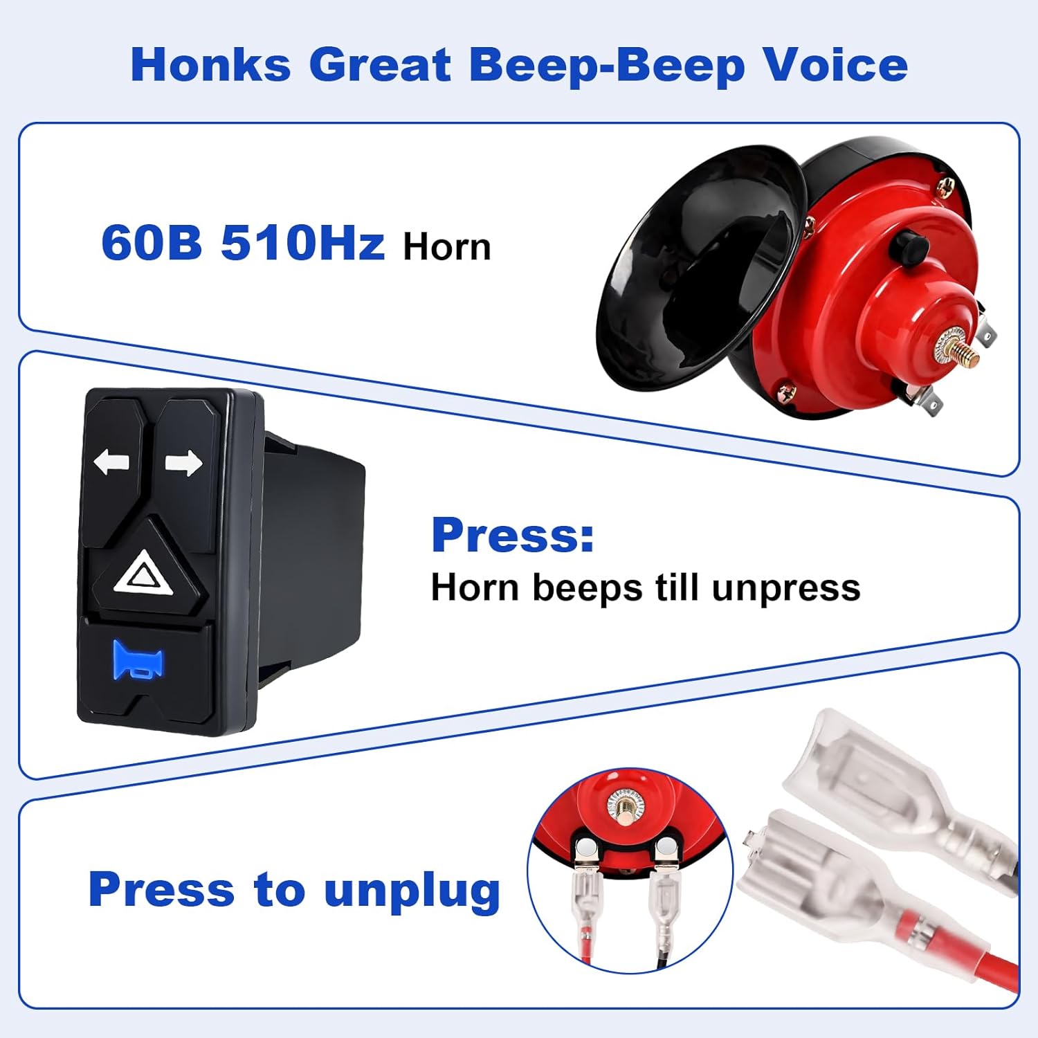 60B 510Hz Horn: Works with a beep-beep sound, delivering clear audible alerts on the road to grab pedestrians and vehicles attention. Press the button of Horn which sound until you release it.