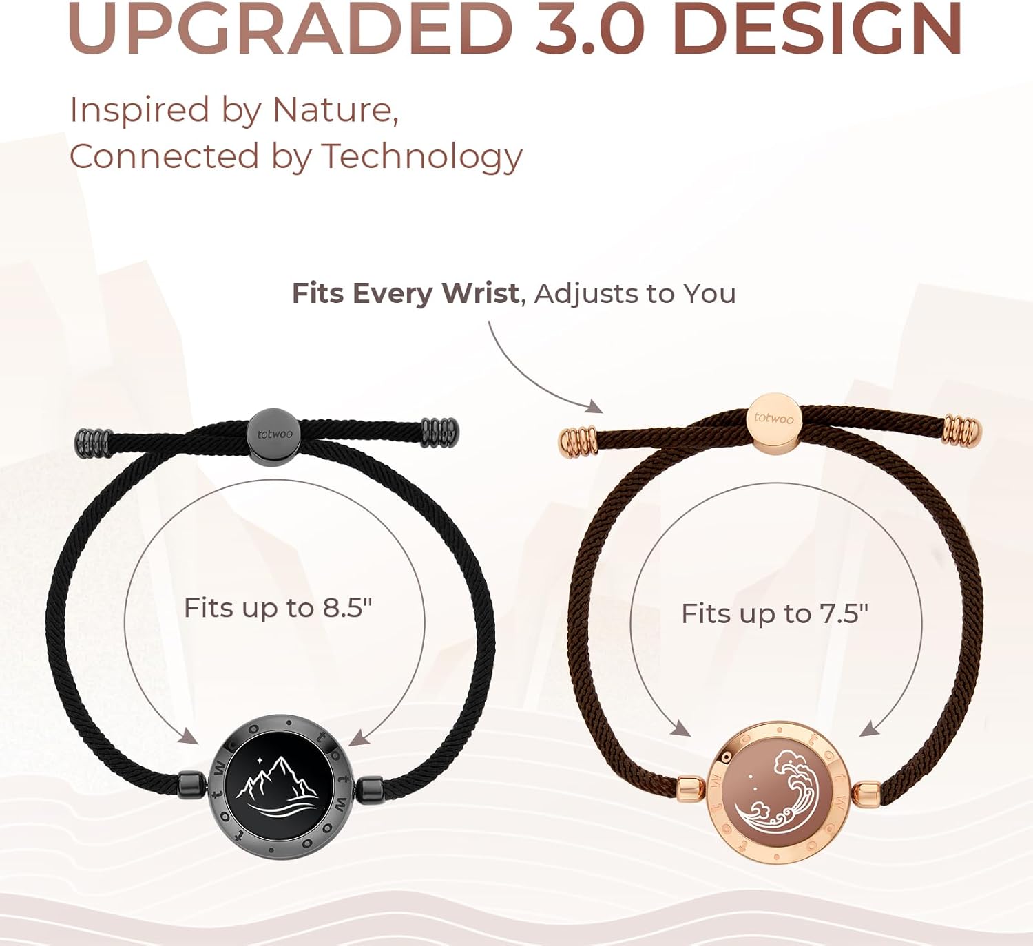 Romantic Design: Adorned with classic mountain and sea symbols,our smart touch bracelets come in stylish options,both engraved with a heartfelt quote. Bracelets are both romantic and adjustable,available in unisex Milan rope styles—black for him and rose gold for her.