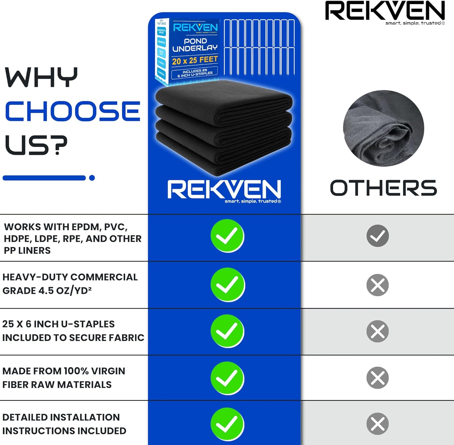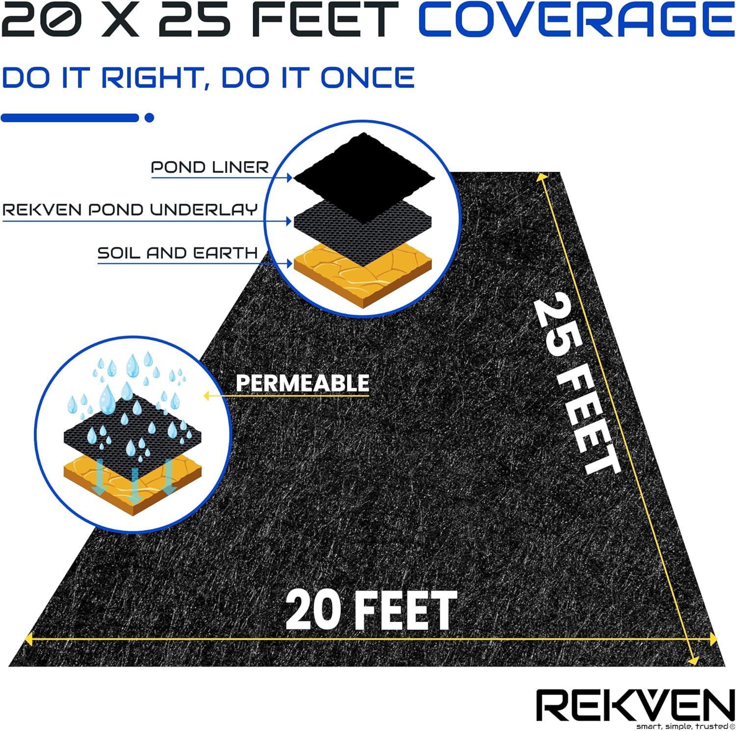 Measures 20 feet wide by 25 feet long, includes easy-to-follow instructions and 25 garden staple U-pins to securely stake down the non-woven fabric, making the pond underlayment installation quick and hassle-free.