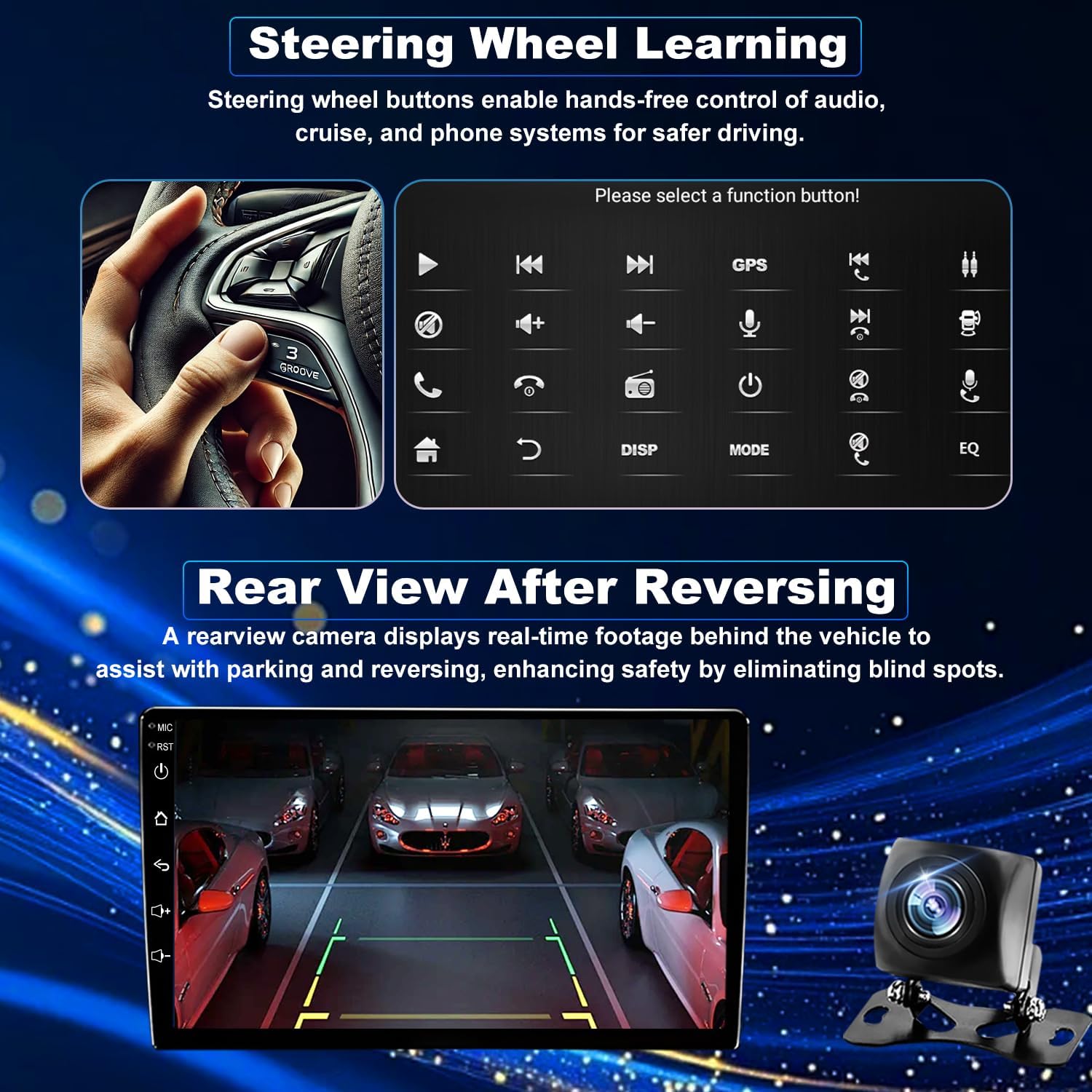 Rearview Camera & Steering Wheel Control This tacoma radio 05-15 retains factory steering wheel controls for safe, easy access to music and volume. The 170° HD backup camera of the Android car radio provides a full rear view, automatically engaging in reverse to help you park safely in tight spots or low visibility