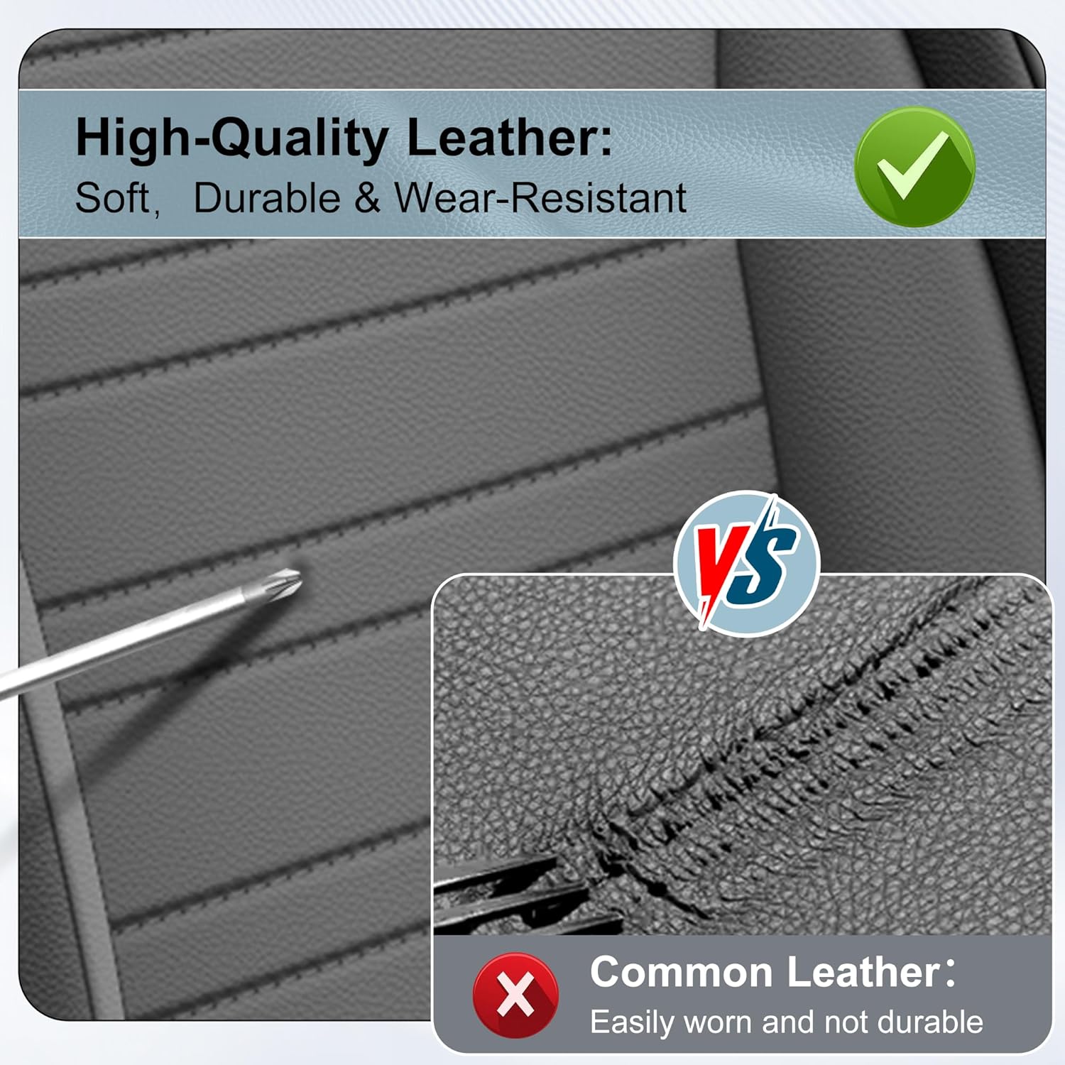 Full Covered Seat Protection: Full coverage front seat covers are crafted from faux leather, soft to touch and comfortable to sit for daily driving. These waterproof automotive seat covers work well to protect the front and rear seats from spills, stains and scratches. Leather seat covers are easy to clean with a damp cloth.