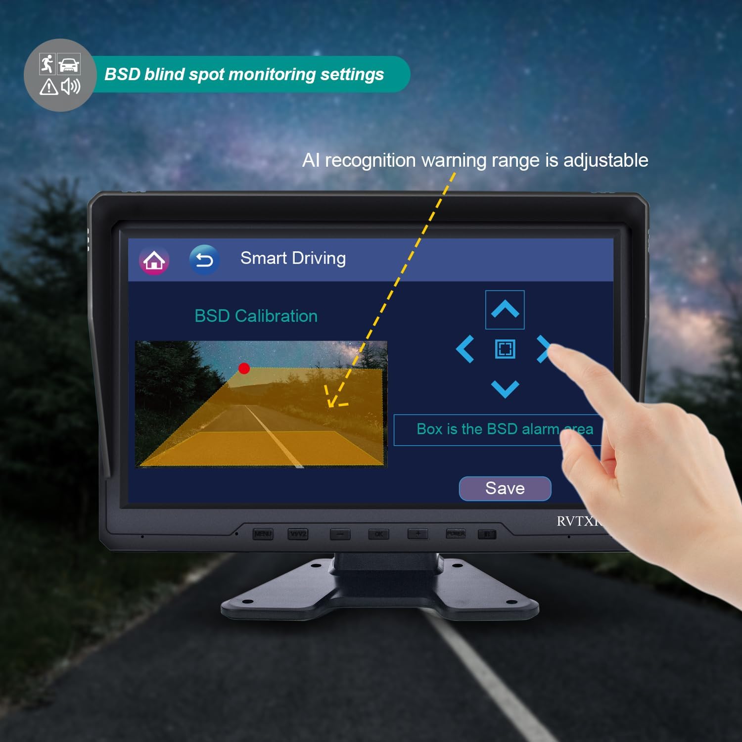 **BSD Safety Alert System** – Built-in Blind Spot Detection (BSD) function supports pedestrian and vehicle detection alarms. When triggered, the monitor’s speaker emits an alert sound. Optional external alarm speaker (sold separately) available for louder warnings.