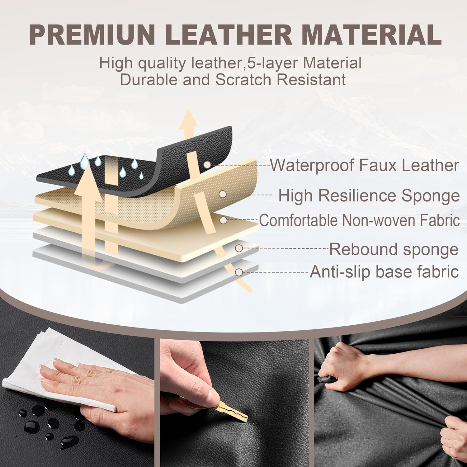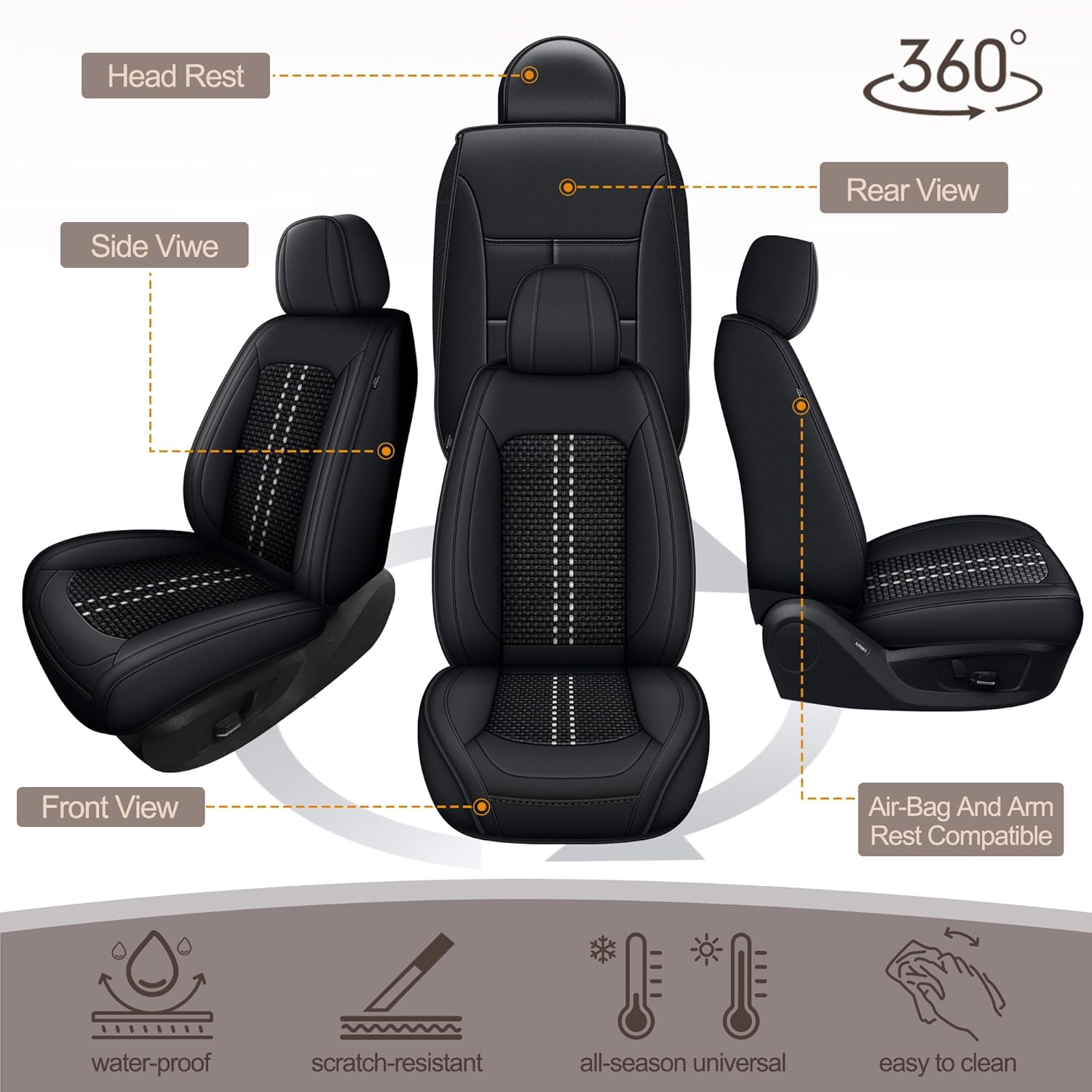 COOL&WATERPROOF MATERIALCooling Seat Covers Are Made With Breathable Ice Silk And Soft Faux Leather To Keep You Cool. The Ice Silk Seat Cover Feels Smooth, Fresh, Prevents Sweating, And Blocks Sunlight. Waterproof Yet Air-Flowing, They Keep You Comfy In Any Weather And Are Easy To Wipe Clean.
