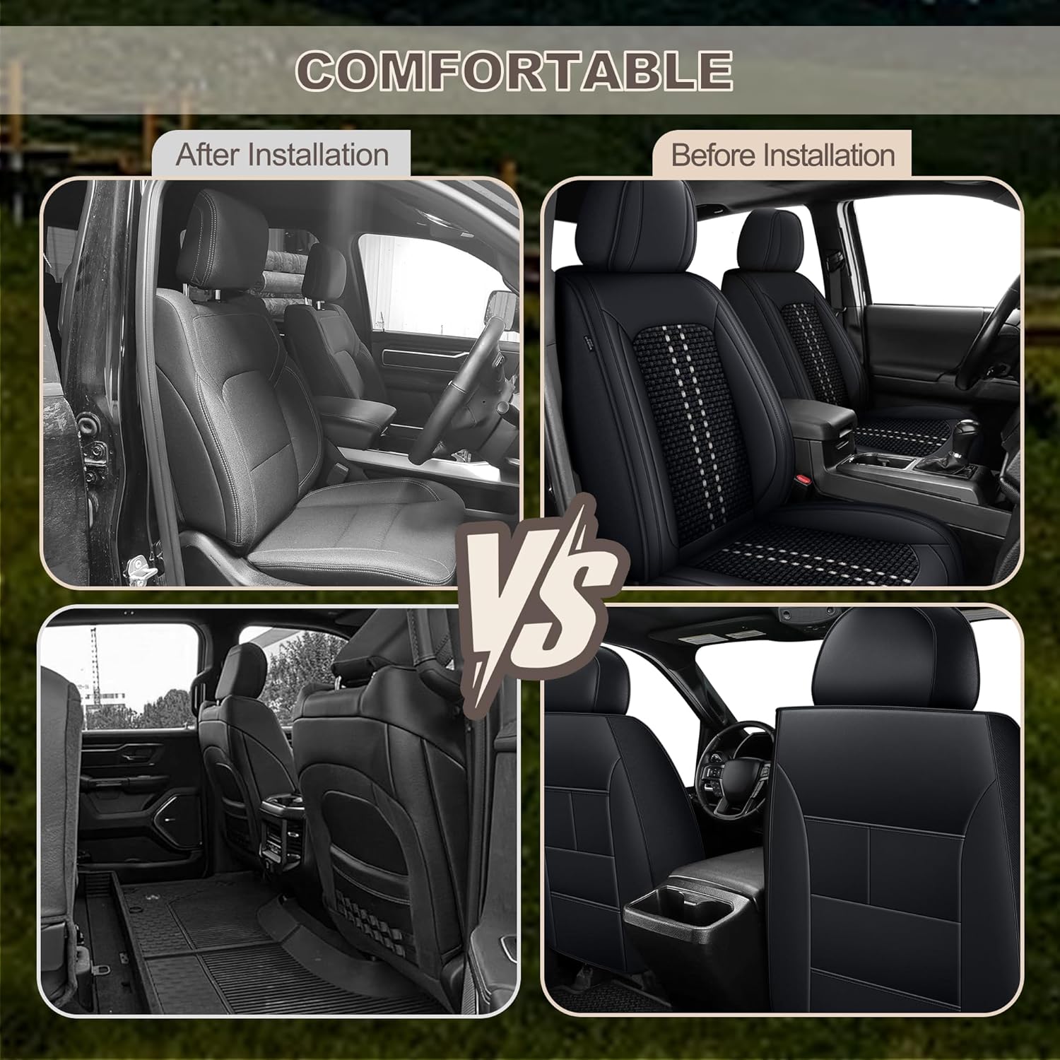 EASY INSTALLATIONThe Seat Covers Features An Easy-Installation Design. You Can Follow The Instruction Manual Included In The Package. The Front Seats Covers Feature Secure Buckle Fasteners.Once Installed, Maintains Secure Protection Without Shifting Or Wrinkles.