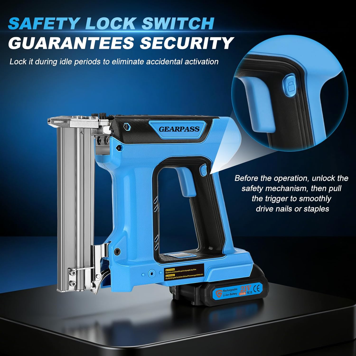 Safety Self-Locking SwitchEquipped with an integrated safety self-locking mechanism, the nail gun activates only when both the trigger and safety switch are pressed simultaneously, effectively preventing accidental firing and ensuring safe use for both beginners and professionals.