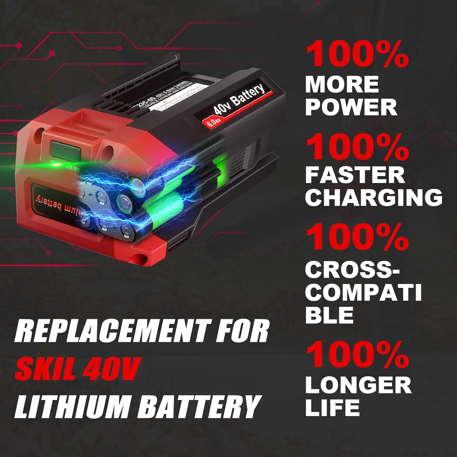LONG LASTING POWER - Engineered with a high-capacity 6000mAh lithium-ion battery, this powerhouse delivers 4X longer runtime and stronger output than the original skil power core 40 battery. Maintain uninterrupted workflow with sustained high performance—no frequent battery swaps needed. Perfect for demanding tasks, it maximizes efficiency by keeping your tools running longer and harder.