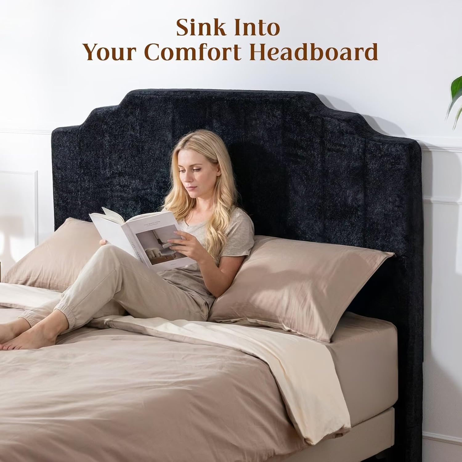 Classic & Luxurious Velvet Headboard: Boasts clean vertical stripe and a stepped crown edge in velvet. Designed to catch and transform light, with every shift in light and view, the velvet`s soft glow adds a layer of depth and dimension to your space