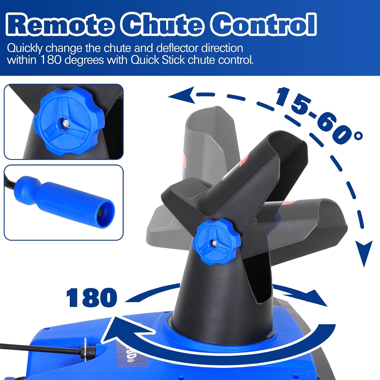 180° Adjustable Chute: Features a 180 ° rotating chute, our corded snow blower can adjusted with a handy stick control for easy control of snow discharge direction, preventing redouble effort.