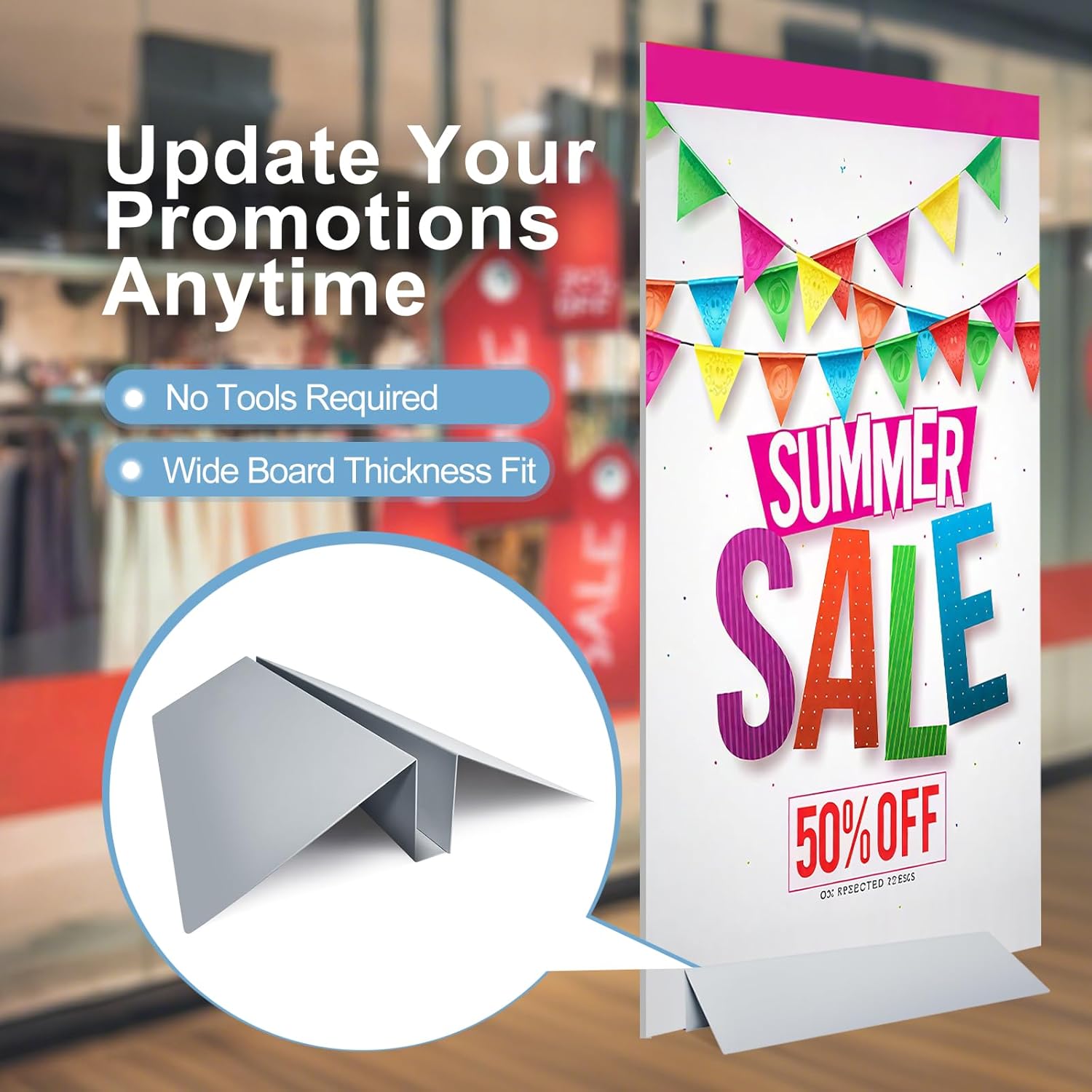 📏【Versatile Use】: Designed with a two-part system, this metal floor sign stand holder securely clamps display boards from 0.25" to 1.5" thick and up to 72" tall, providing flexible support for various foam board stands and signage needs.