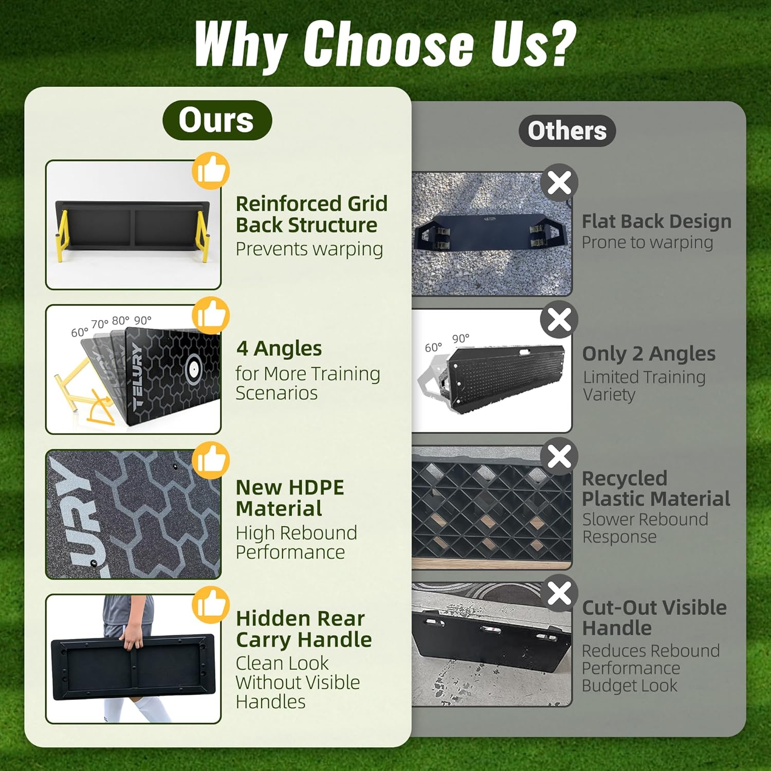 Portable Design with Hidden Rear Carry Handle: At 32 x 12 inches, this soccer rebounder board remains lightweight yet sturdy for easy transport between home, field, or training sessions. The hidden rear handle keeps the front surface clean with no cut outs, preserving rebound consistency and delivering a more professional appearance