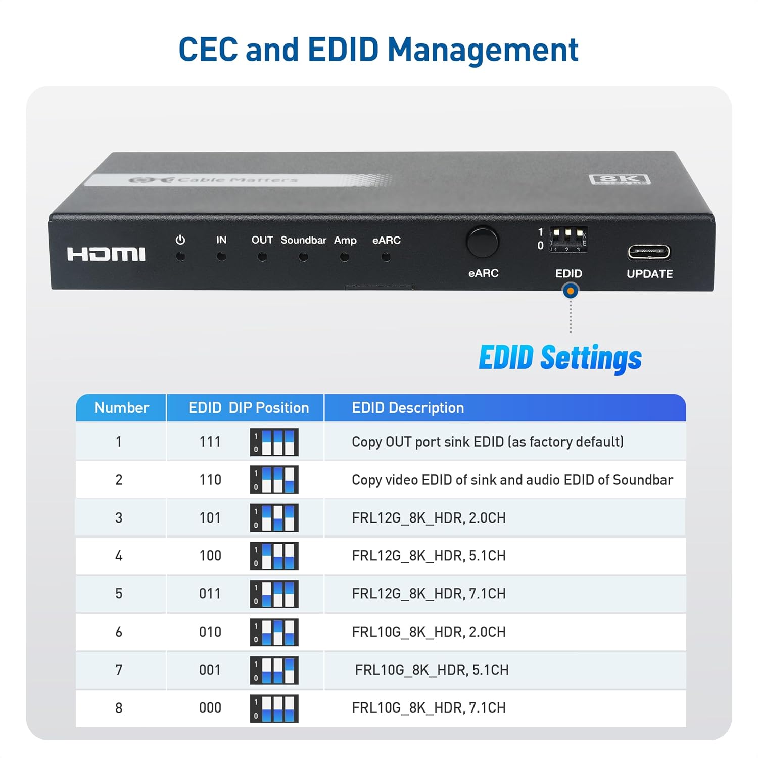 CEC/EDID Guidance: CEC behavior may varies by TV brand. The extractor features advanced EDID management and cable equalization to ensure reliable performance with your home theater setup. It does not include built-in volume control—please use your TV, soundbar, or AVR instead (earphones/headphones are not supported). If you experience power toggling or signal cutouts, try disabling CEC/auto power or setting a fixed input.
