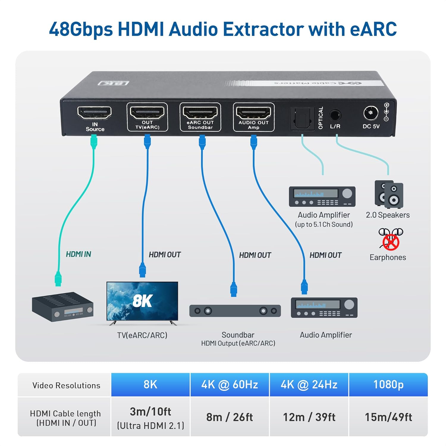 48Gbps HDMI 2.1 Audio Extractor: Extract high-quality audio from HDMI sources via HDMI, optical (S/PDIF), or analog outputs for soundbars, AV receivers, amplifiers, and speakers. Supports up to 48Gbps bandwidth and eARC/ARC audio formats including Dolby TrueHD, Atmos, DTS-HD MA, and LPCM 7.1. Optical output supports up to 5.1 only (no 7.1 downmix).