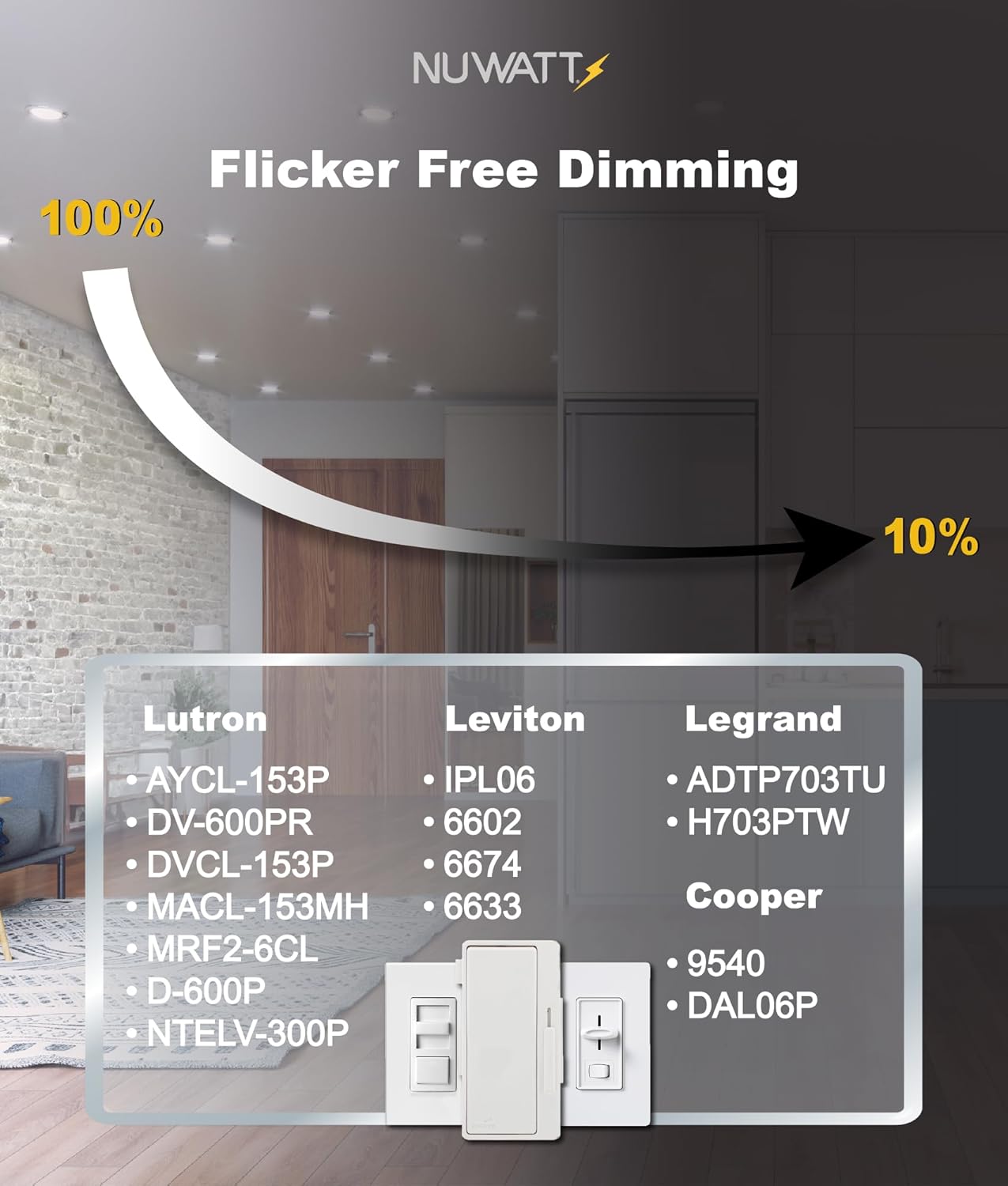 Personalized Lighting: Enjoy customized lighting control with the NuWatt Canless LED Recessed Light 4 Inch. This light offers dimmability from 10%-100%, allowing you to set your ambiance by adjusting the lights from bright to dim to your preference. Ideal for residential lighting, office lighting, restaurant lighting, or commercial lighting.