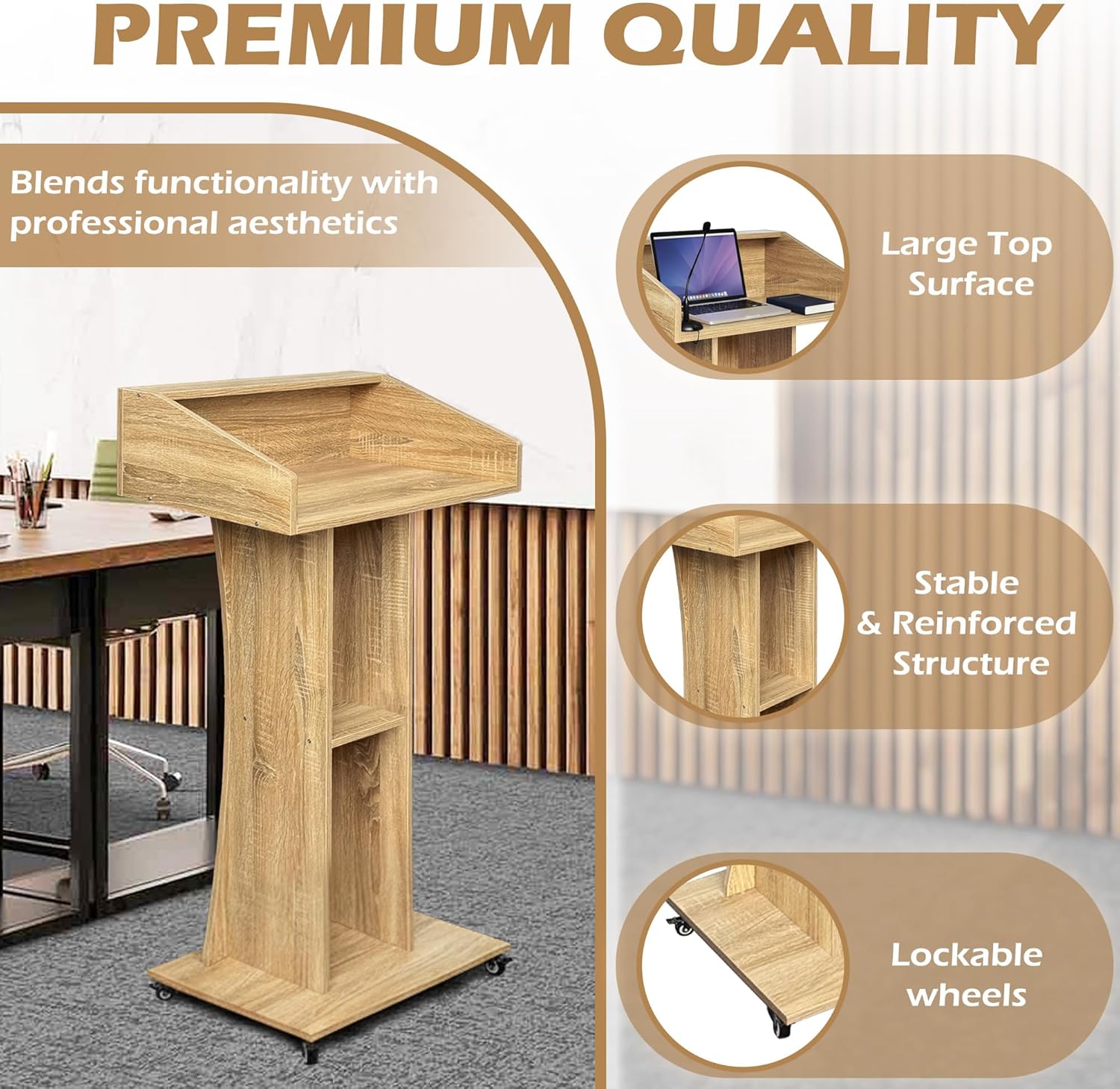 【Spacious Presentation Surface】The large top platform provides ample space for a laptop, tablet, notes, or microphone setup. A raised edge keeps your items secure while you present, making it ideal for lectures, sermons, or corporate meetings.