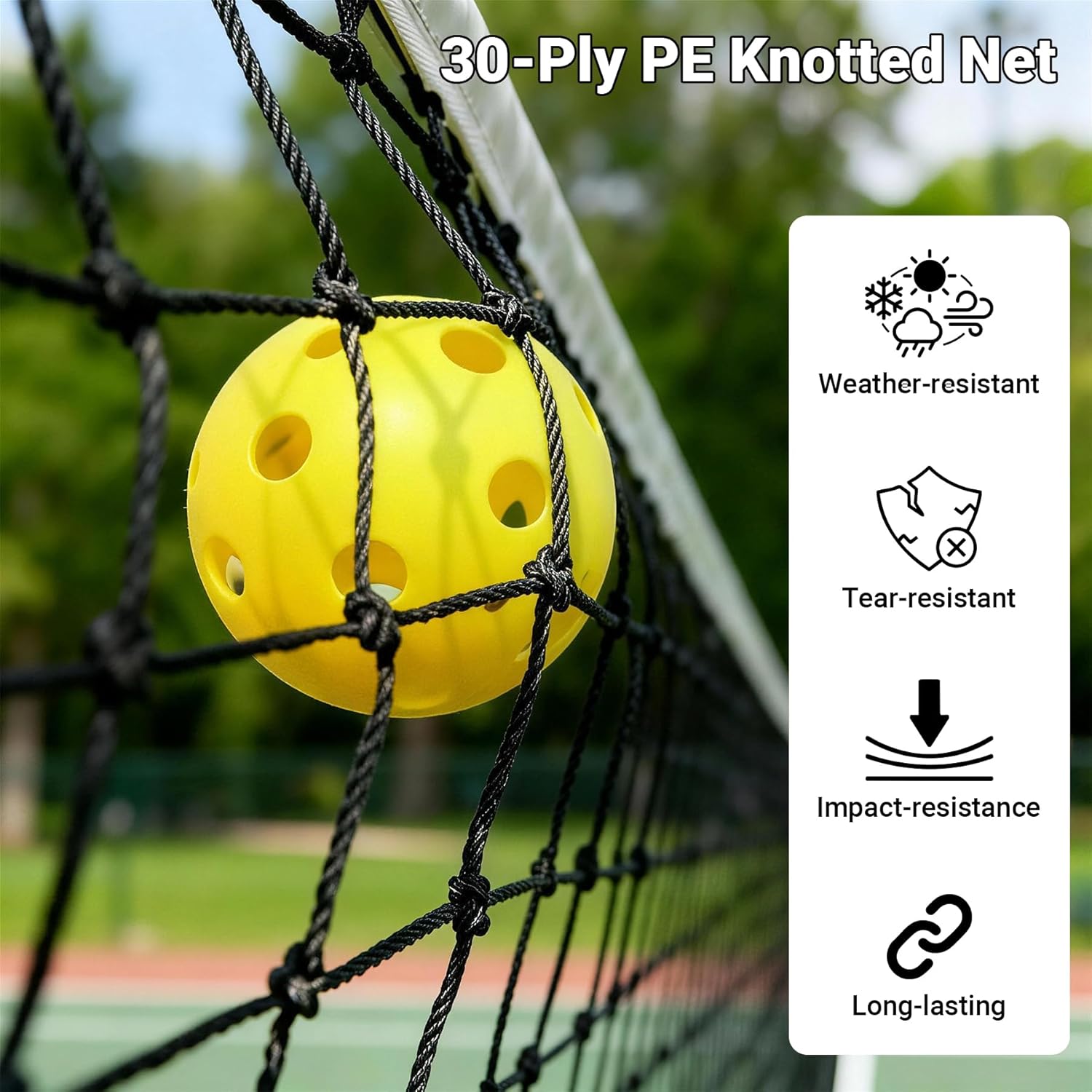 30-Ply PE Knotted Net - Built Tough: Premium weather-resistant, tear-proof, and impact-resistant net; Resists UV rays, rain, snow and extreme temperatures; Long-lasting durability without sagging or fraying - ideal for year-round use
